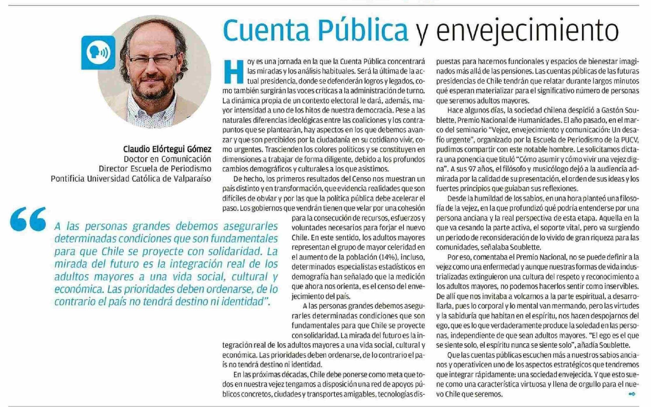Columnas de Opinión: Cuenta Pública y envejecimiento 01-06-2025 El Mercurio de Valparaíso |