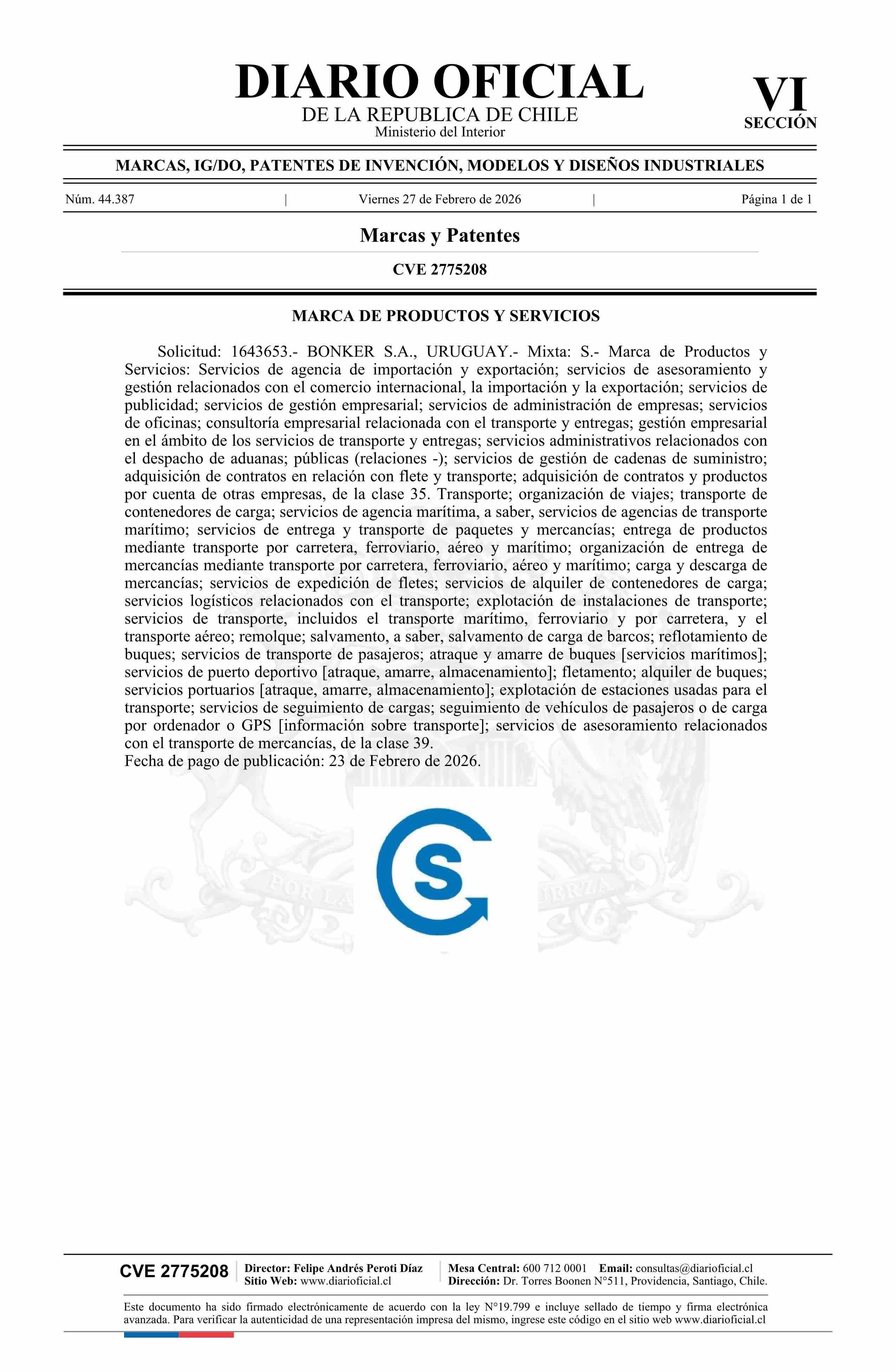 Fuente: Diario Oficial Edición Electrónica (Diario Oficial de Chile - 6 Marcas Y Patentes) Página(s): 30