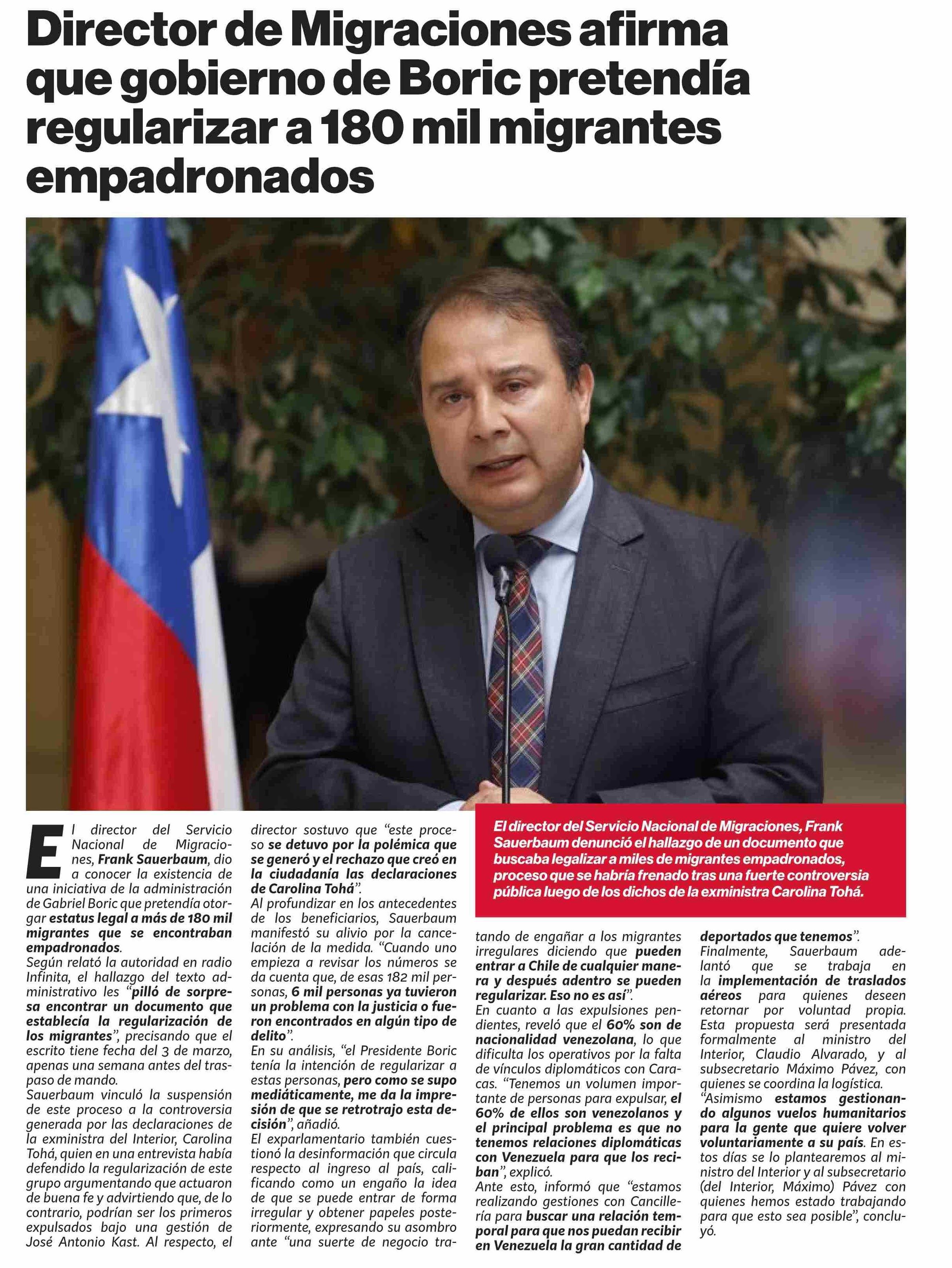 Título: Director de Migraciones afirma que gobierno de Boric pretendía regularizar a 180 mil migrantes empadronados