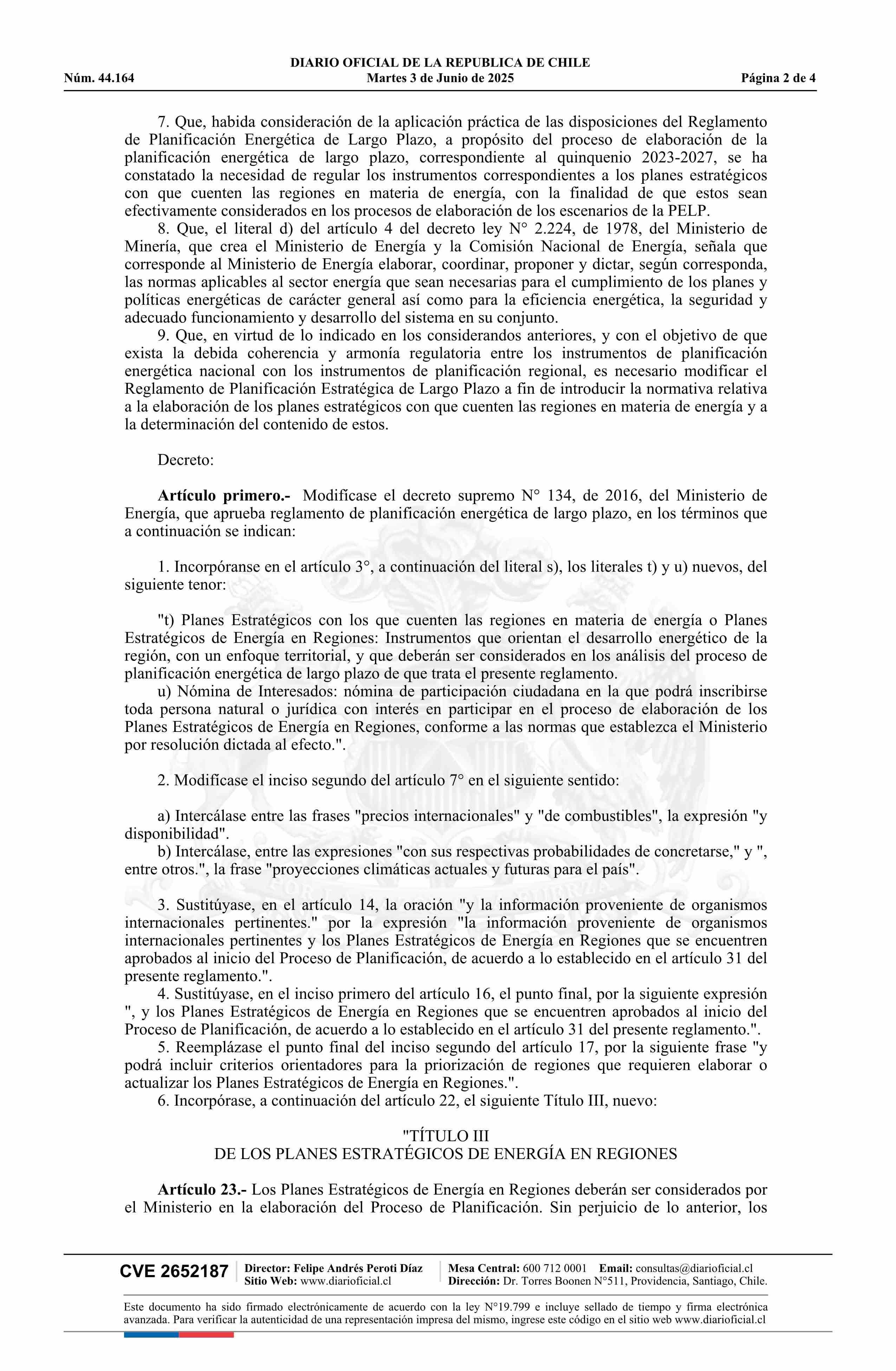 Decreto número 51, de 2024.- Modifica decreto N° 134, de 2016, que aprueba Reglamento de Planificación Energética de Largo Plazo 03-06-2025 DIARIO OFICIAL CHILE - BOLETÍN OFICIAL DE MINERÍA |
