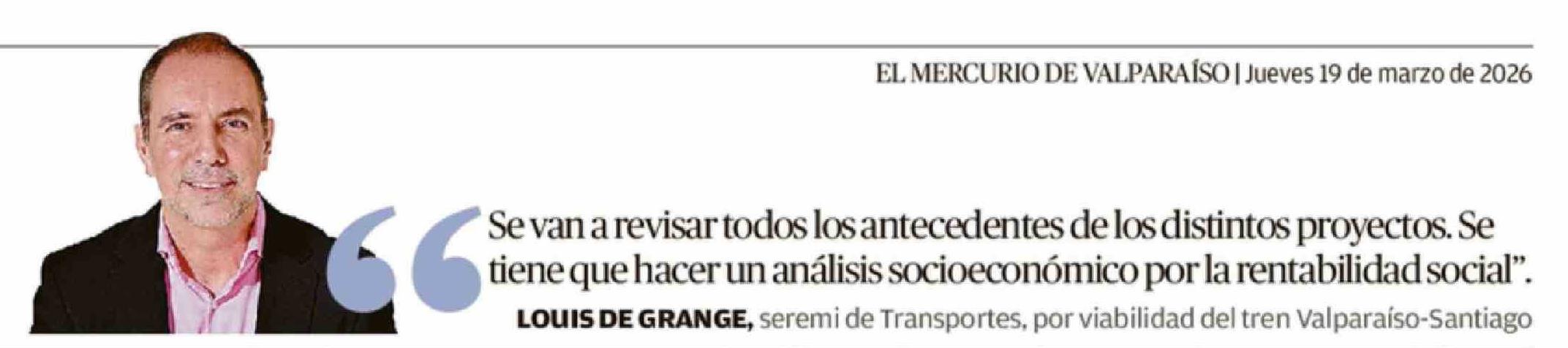 Título: Se van a revisar todos los antecedentes de los distintos proyectos. Se tiene que hacer un análisis socioeconómico por la rentabilidad social". LOUIS DE GRANGE, seremi de Transportes, por viabilidad del tren Valparaíso-Santiago