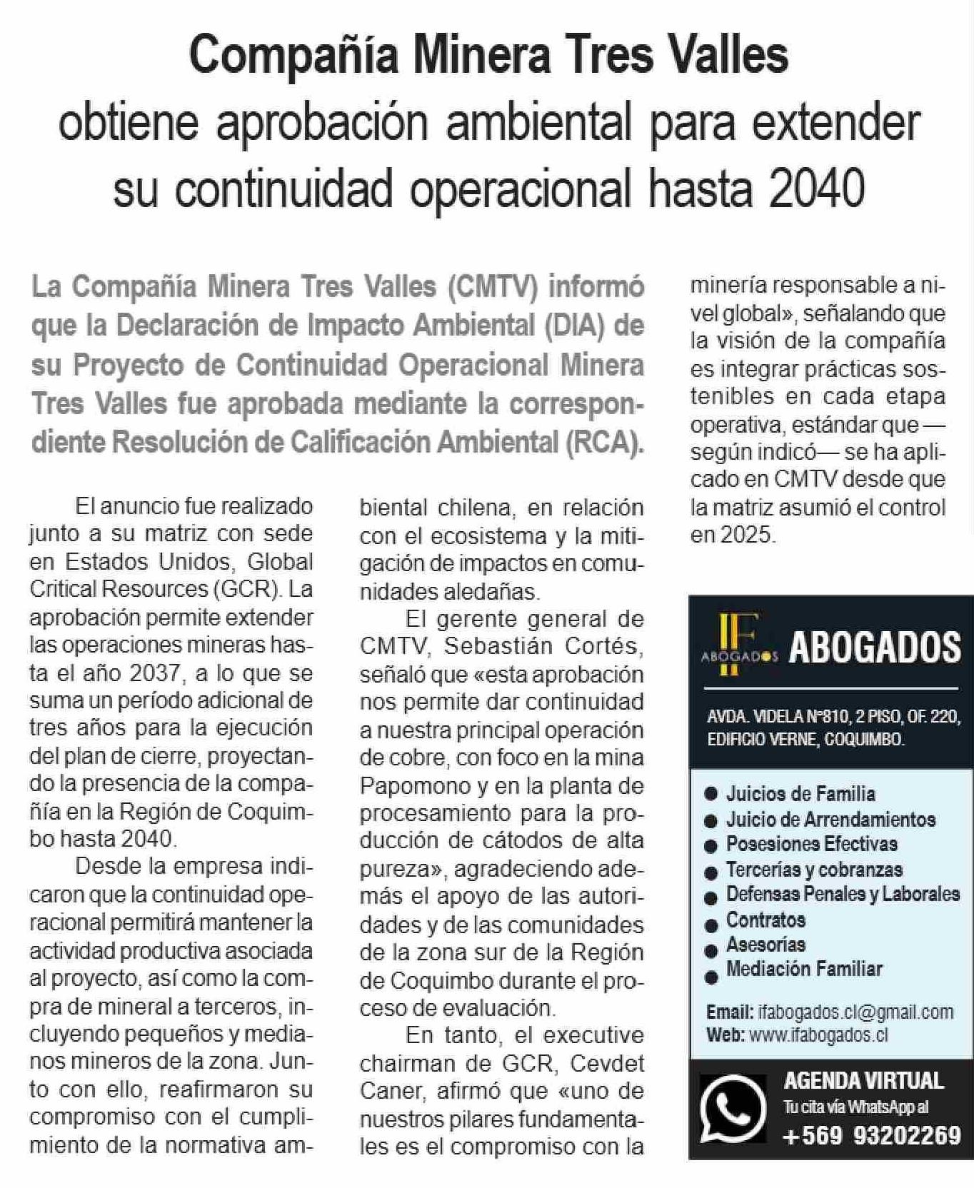 Título: Compañía Minera Tres Valles obtiene aprobación ambiental para extender su continuidad operacional hasta 2040