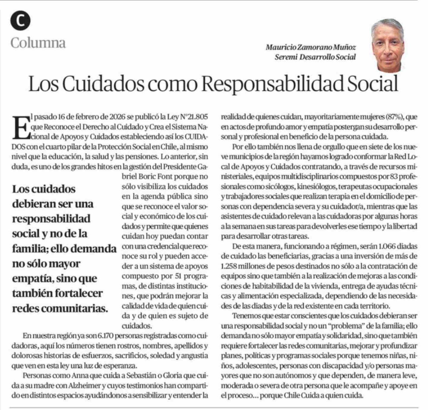 Columnas de Opinión: Los Cuidados como Responsabilidad Social 23-02-2026 El Mercurio de Antofagasta |