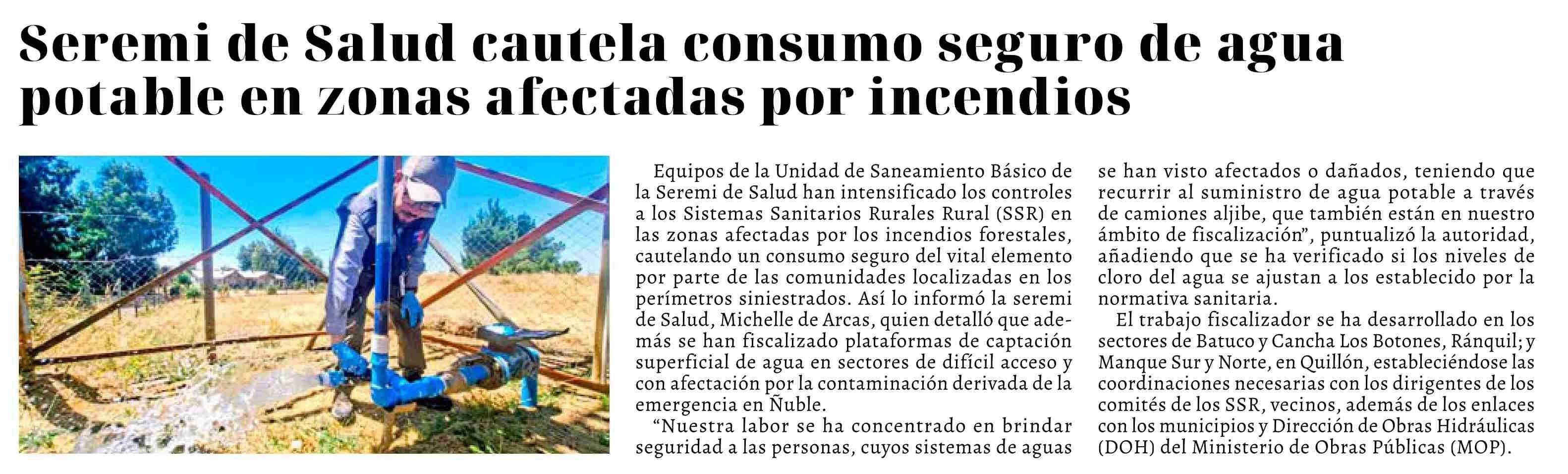 | Título: | Seremi de Salud cautela consumo seguro de agua potable en zonas afectadas por incendios |