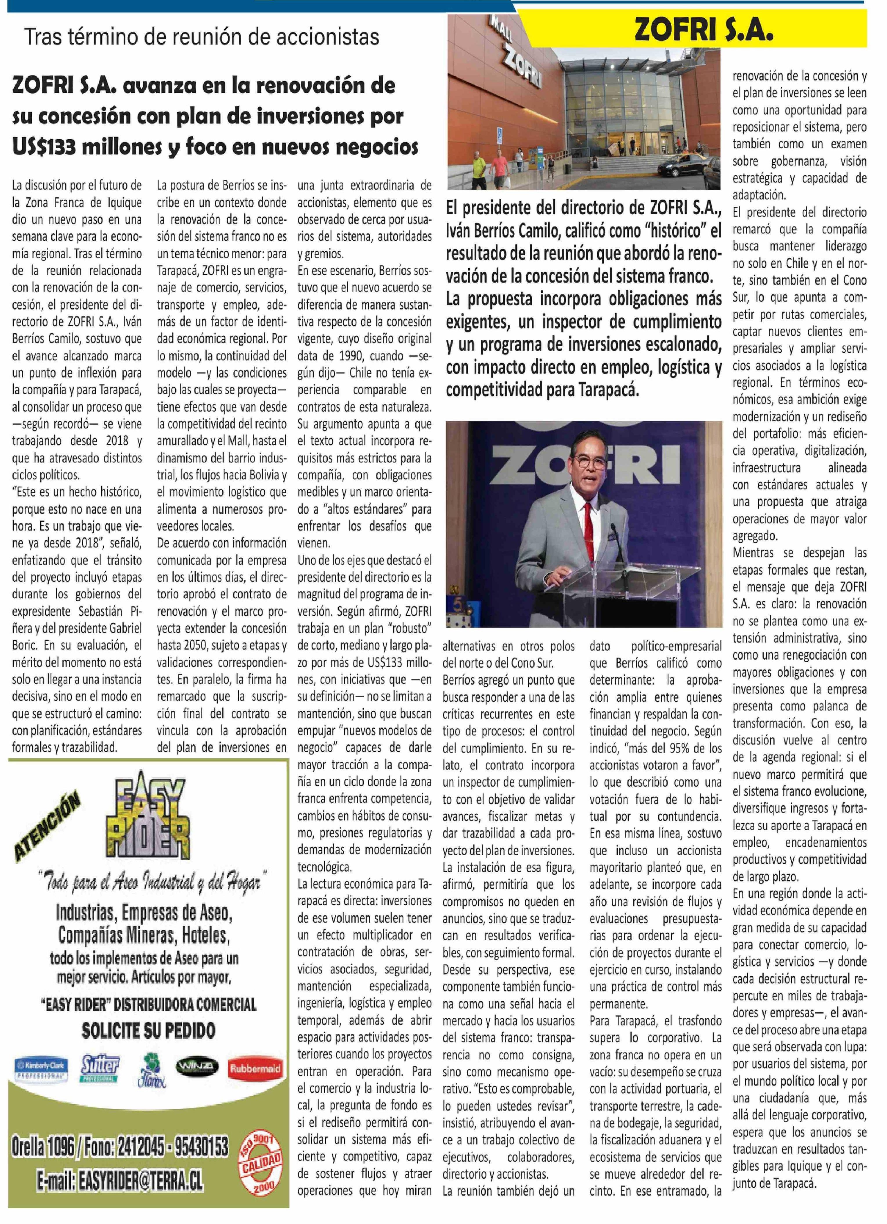 Título: ZOFRI S.A. avanza en la renovación de su concesión con plan de inversiones por US$133 millones y foco en nuevos negocios