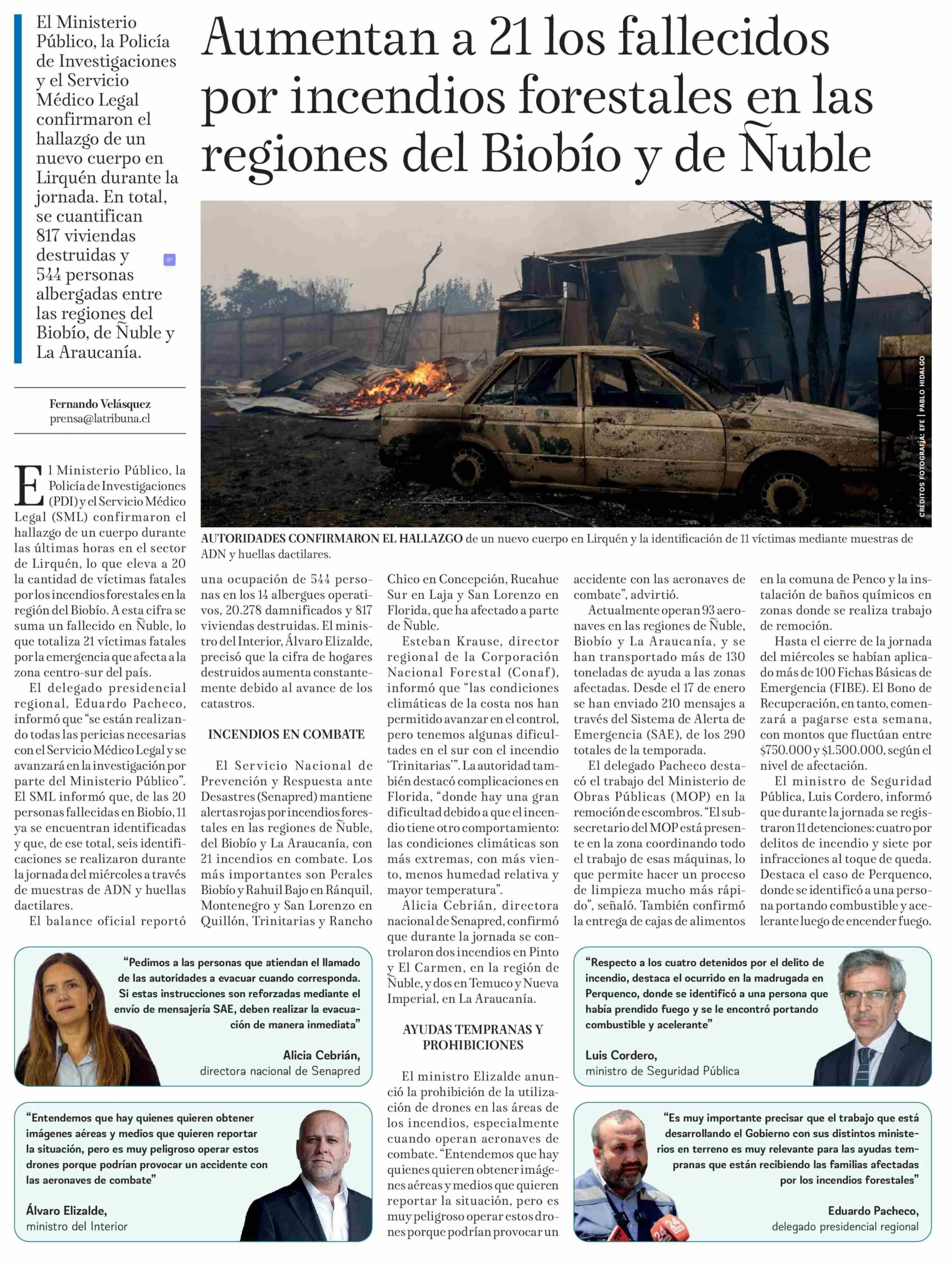 Título: Aumentan a 21 los fallecidos por incendios forestales en las regiones del Biobío y de Nuble