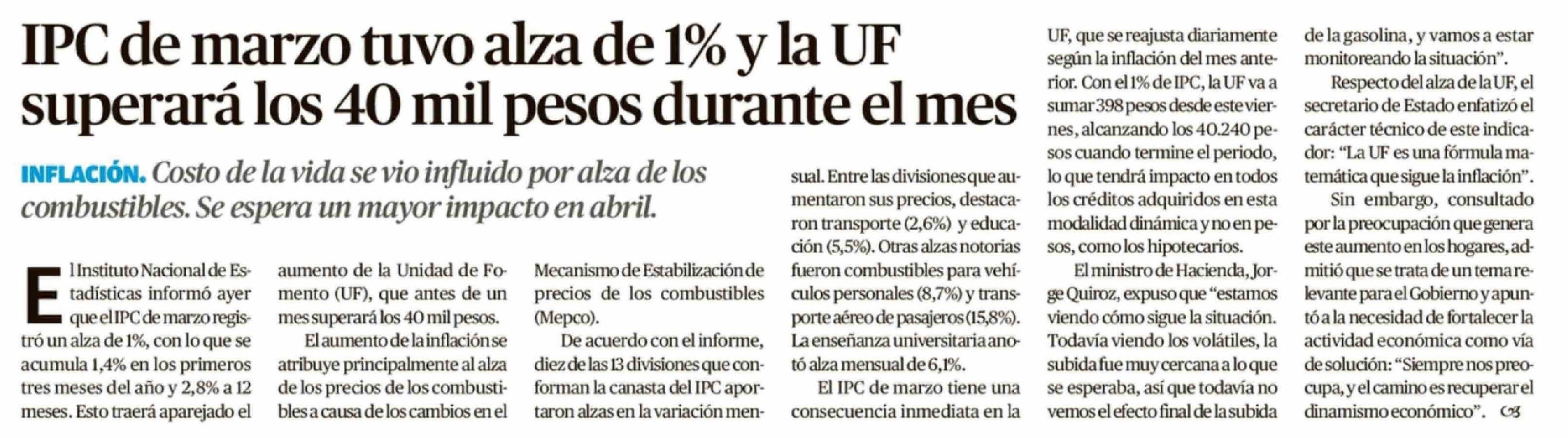 | Título: | IPC de marzo tuvo alza de 1% y la UF superará los 40 mil pesos durante el mes |
