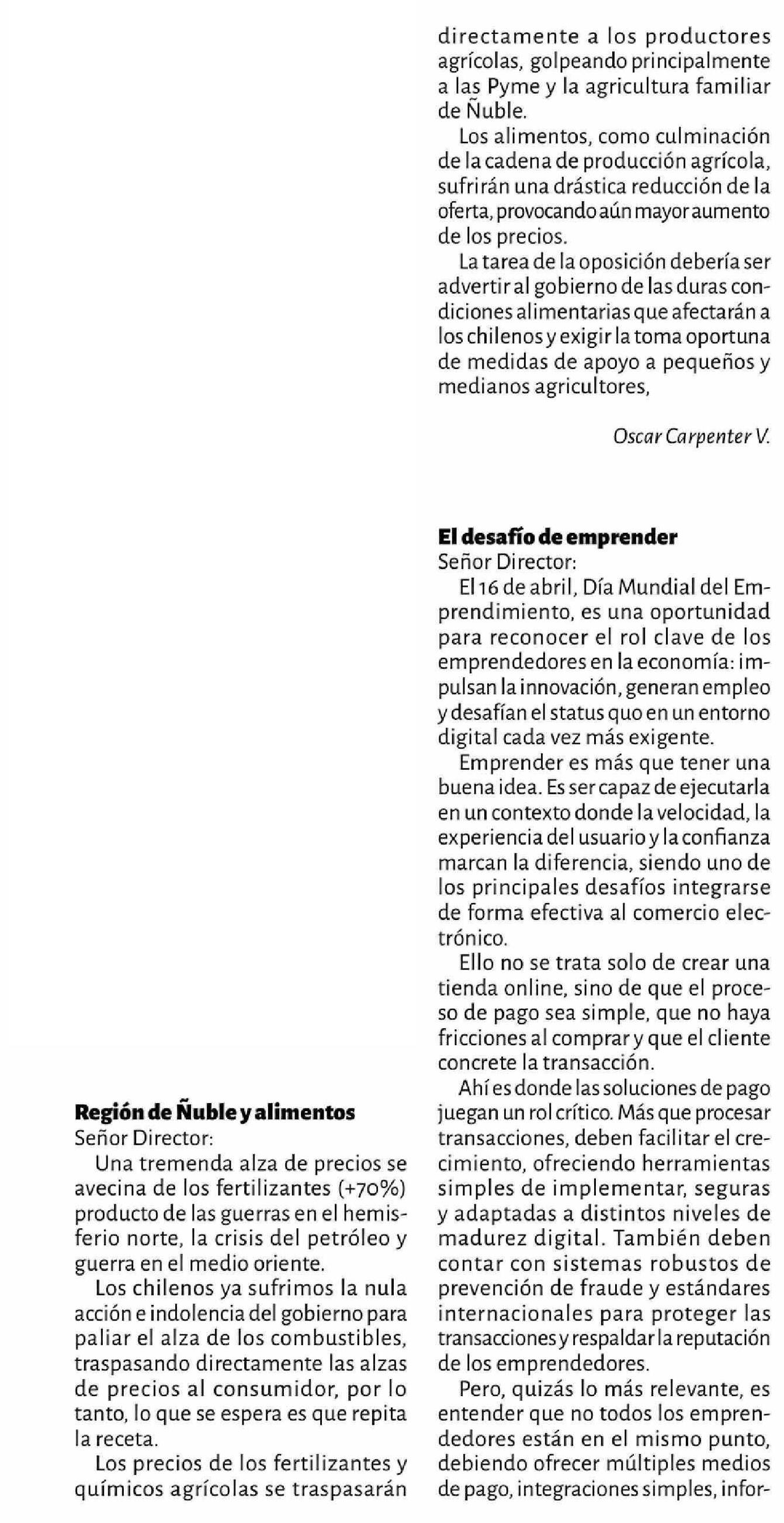 CARTAS: Región de Ñuble y alimentos 18-04-2026 La Discusión |