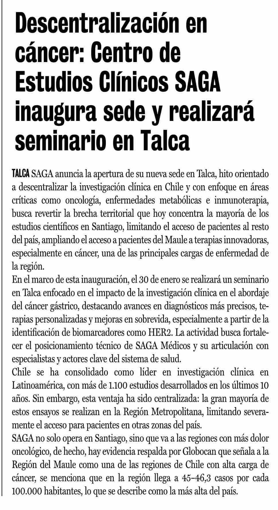 Título: Descentralización en cáncer: Centro de Estudios Clínicos SAGA inaugura sede y realizará seminario en Talca