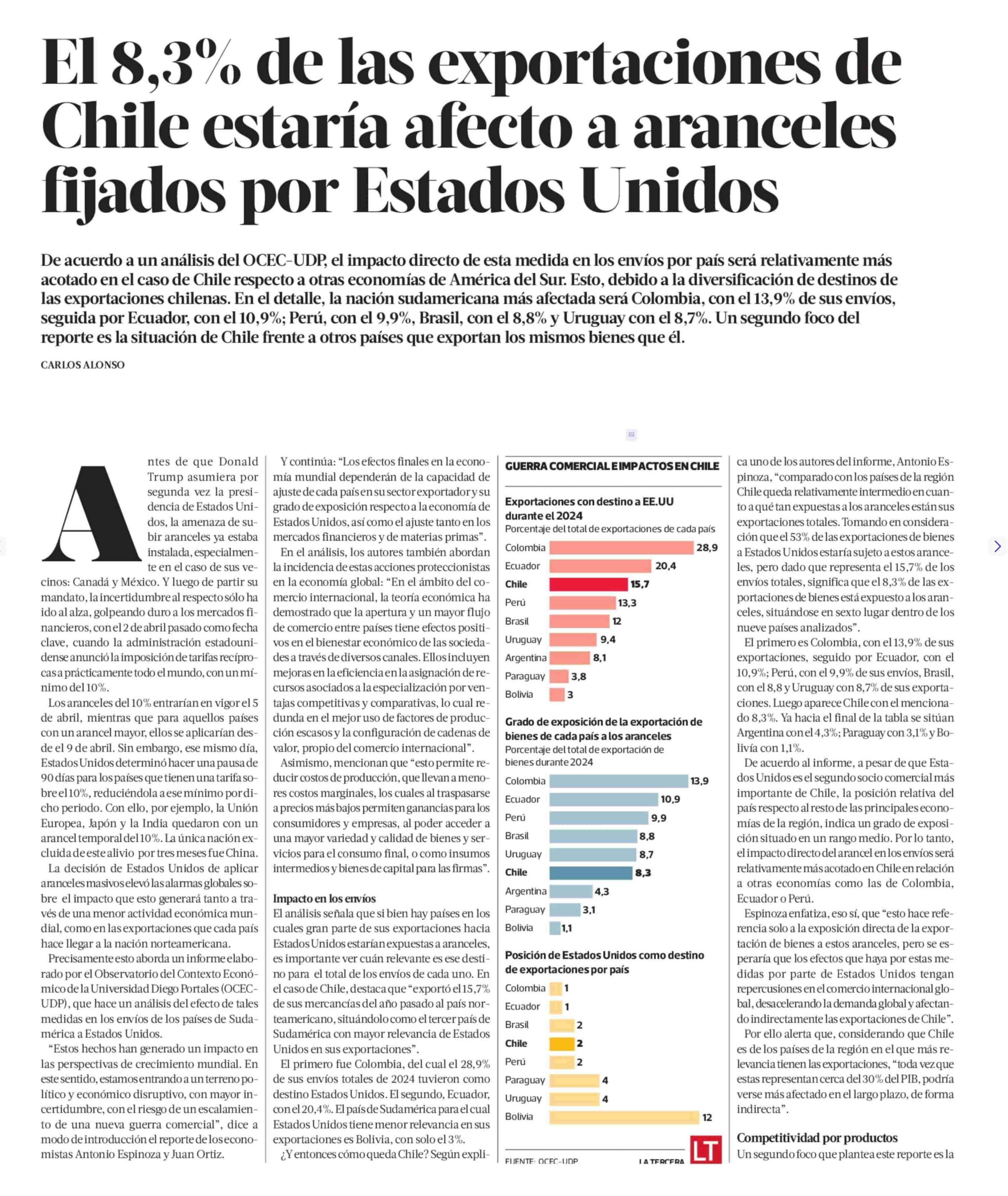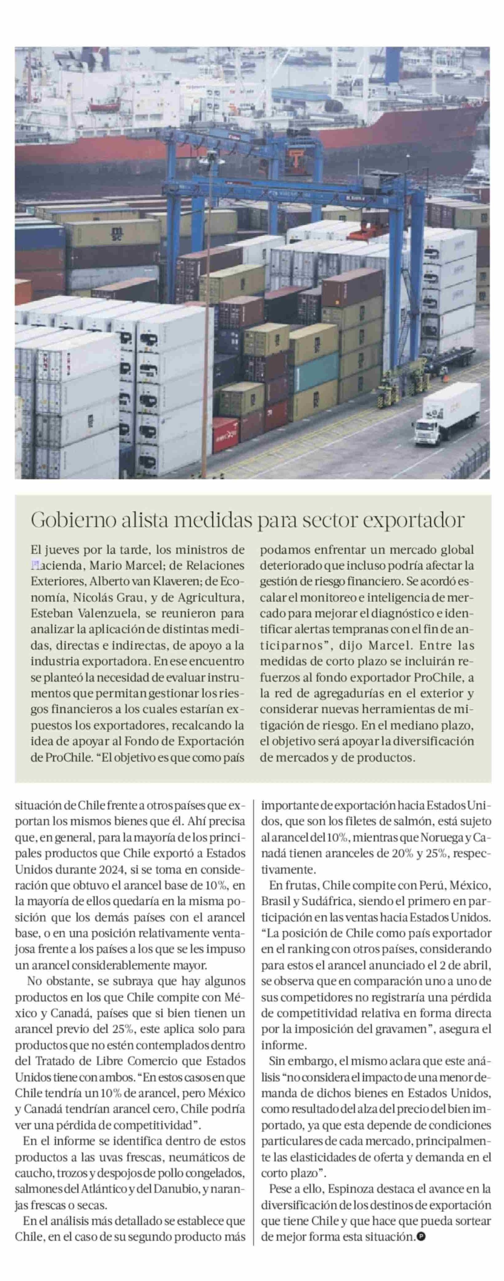 El 8,3% de las exportaciones de Chile estaría afecto a aranceles fijados por Estados Unidos 19-04-2025 La Tercera |
