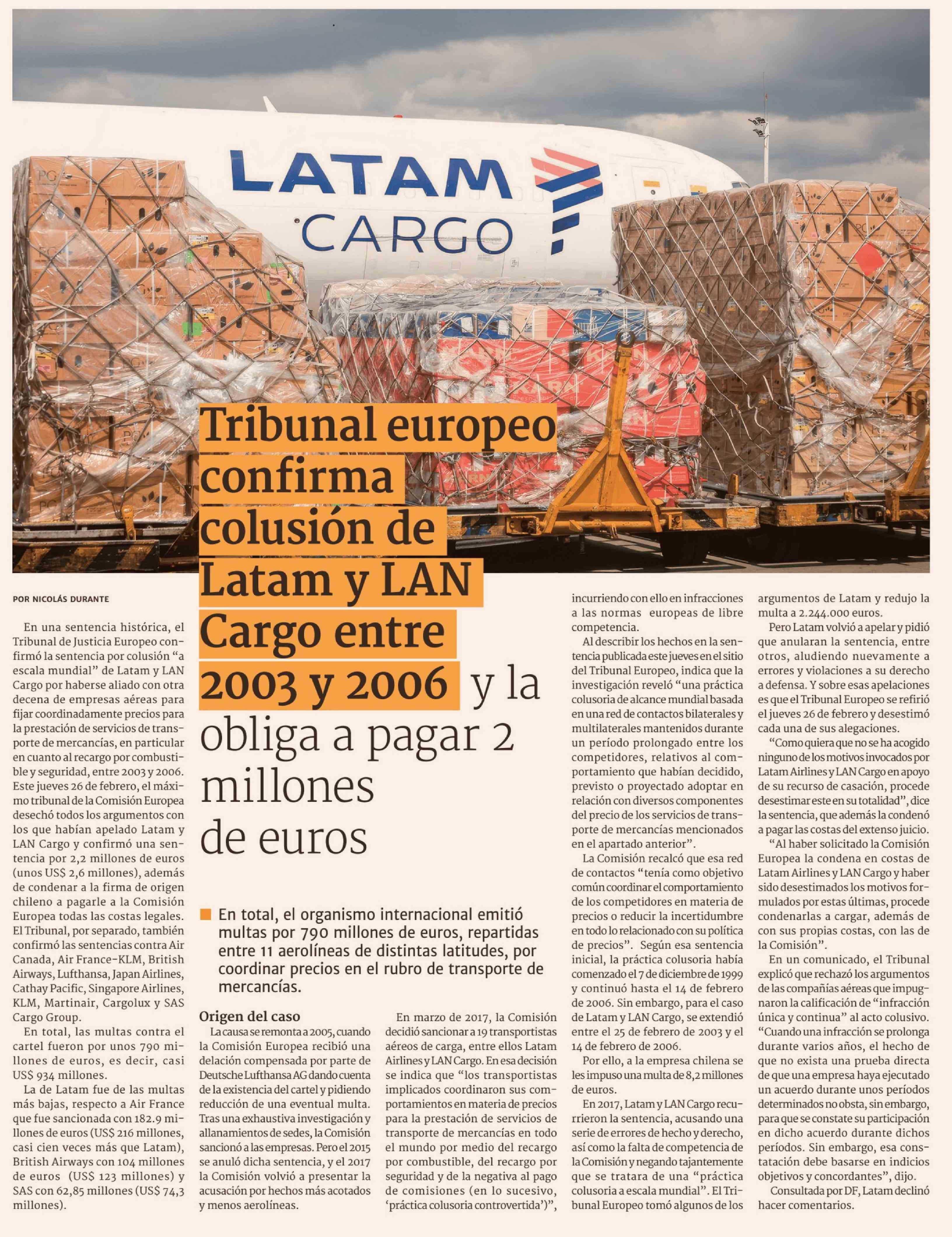 Título: Tribunal europeo confirma colusión de Latam y LAN Cargo entre 2003 y 2006 y la obliga a pagar 2 millones de euros