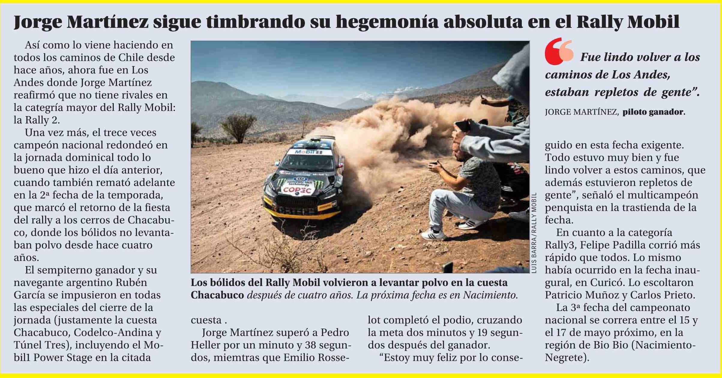 Jorge Martínez sigue timbrando su hegemonía absoluta en el Rally Mobil 13-04-2026 El Mercurio |