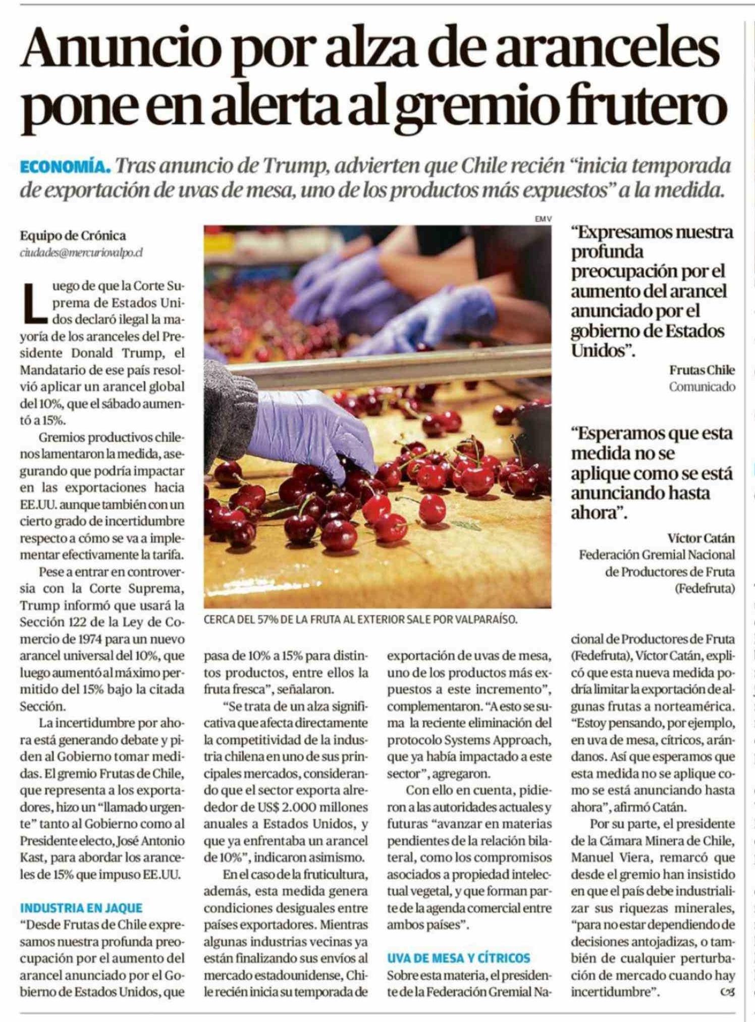 Anuncio por alza de aranceles pone en alerta al gremio frutero 24-02-2026 El Mercurio de Valparaíso |