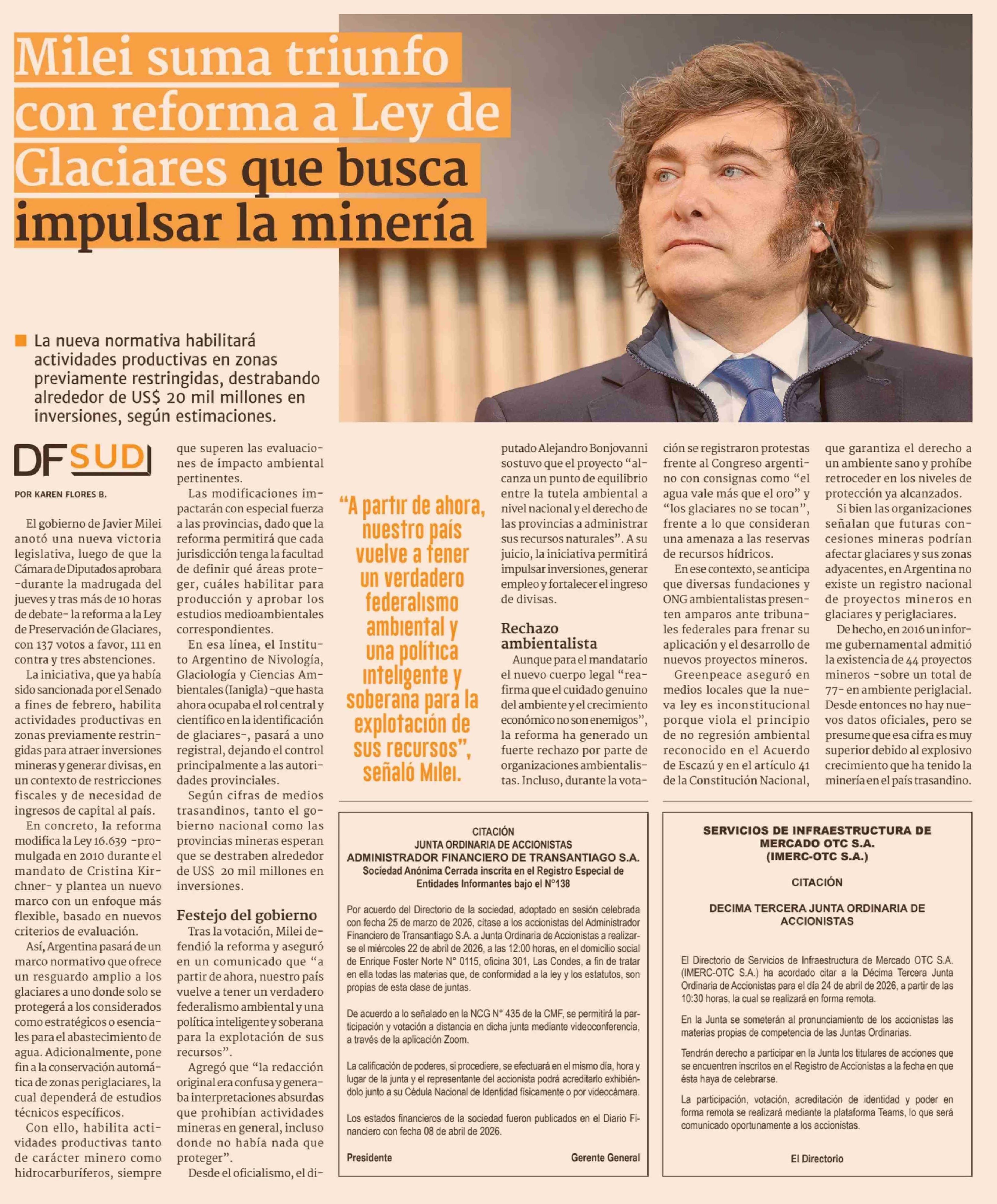Milei suma triunfo con reforma a Ley de Glaciares que busca impulsar la minería 10-04-2026 Diario Financiero |