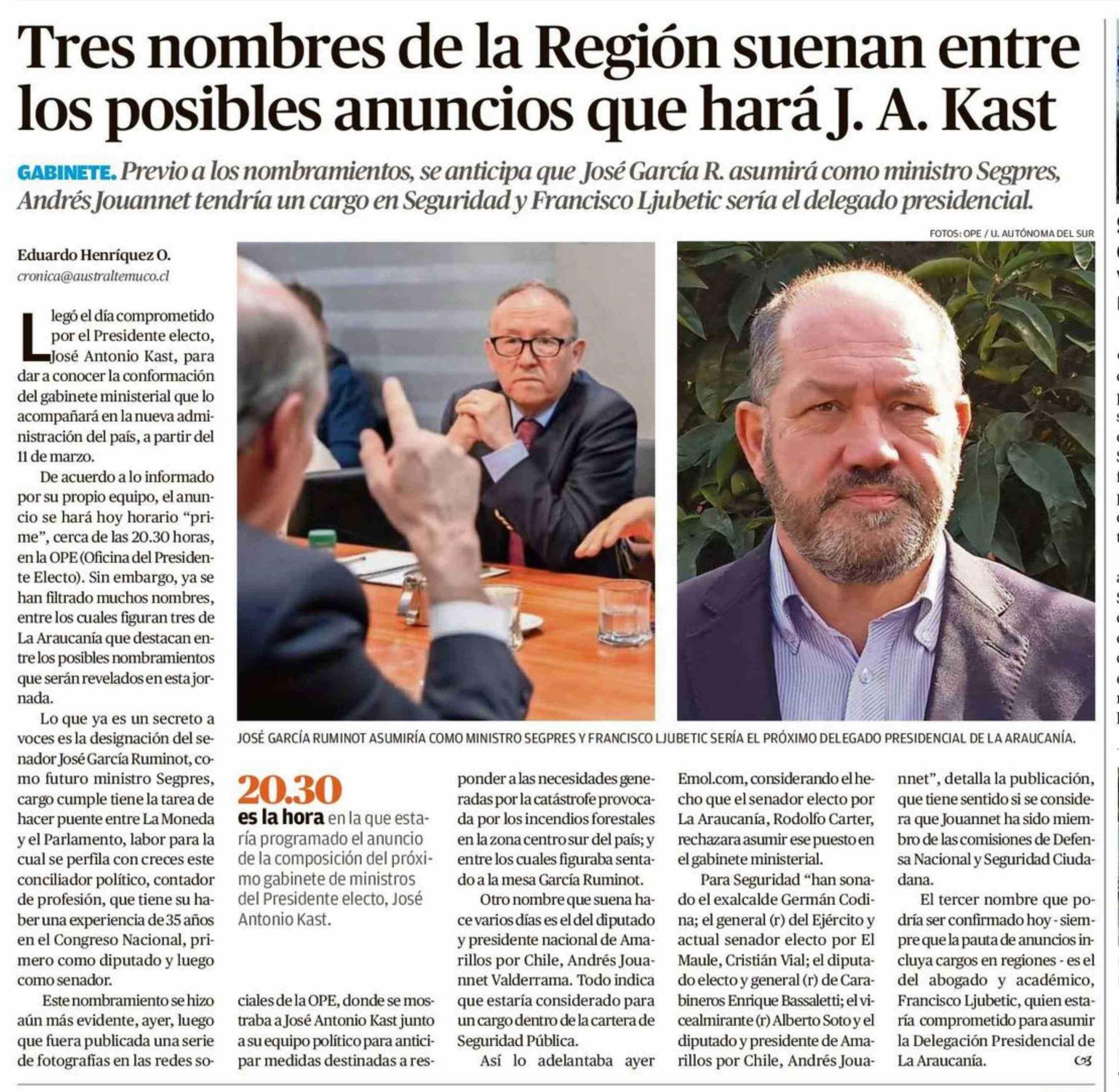 Tres nombres de la Región suenan entre los posibles anuncios que hará J. A. Kast 20-01-2026 El Austral de la Araucanía |