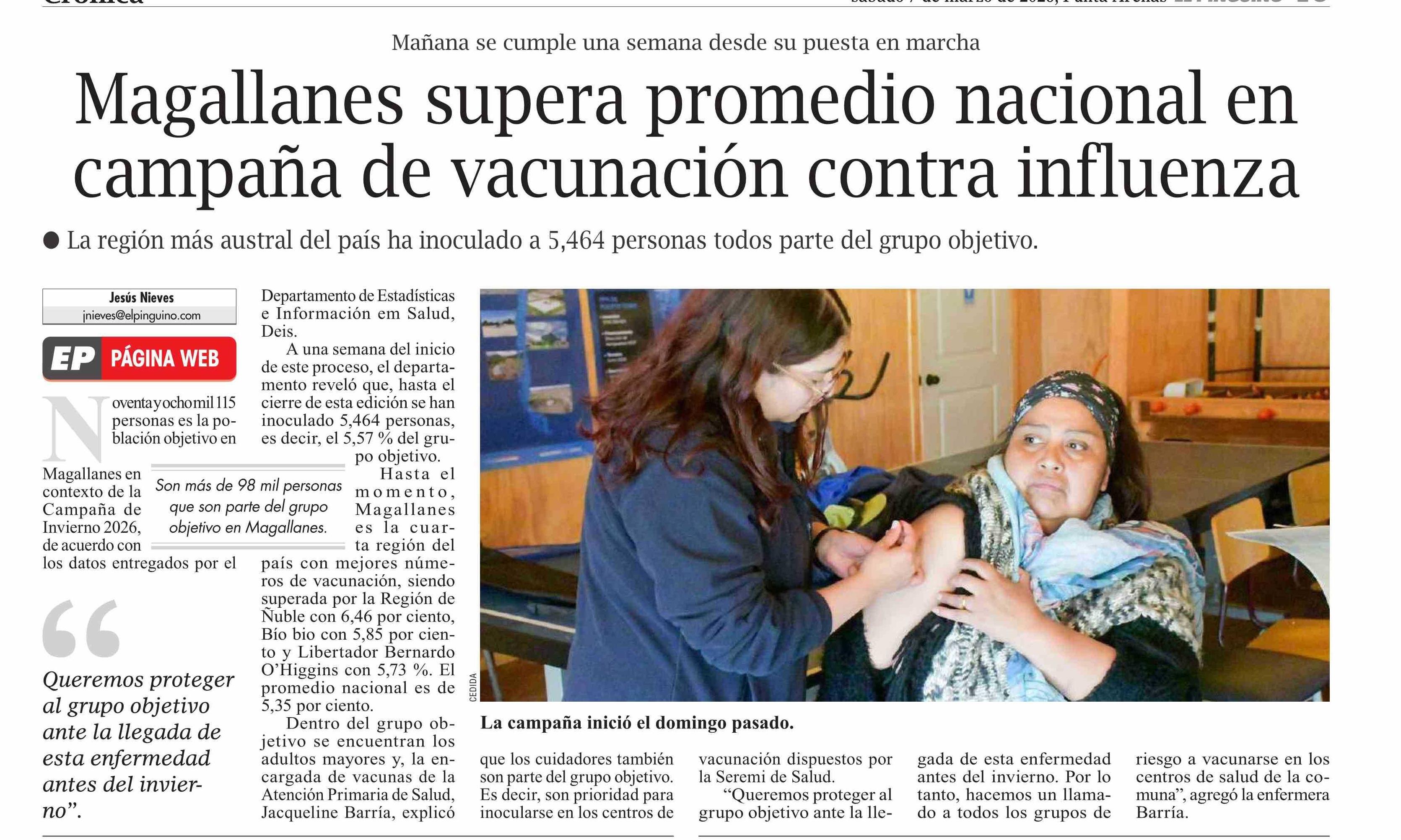 Magallanes supera promedio nacional en campaña de vacunación contra influenza 07-03-2026 El Pingüino |