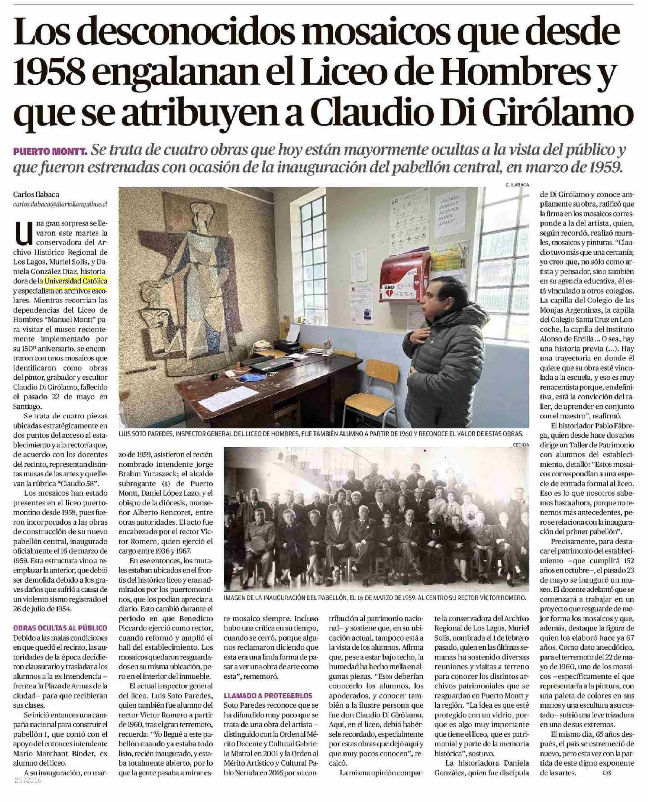 Los desconocidos mosaicos que desde 1958 engalanan el Liceo de Hombres y que se atribuyen a Claudio Di Girolamo 15-06-2025 El Llanquihue |