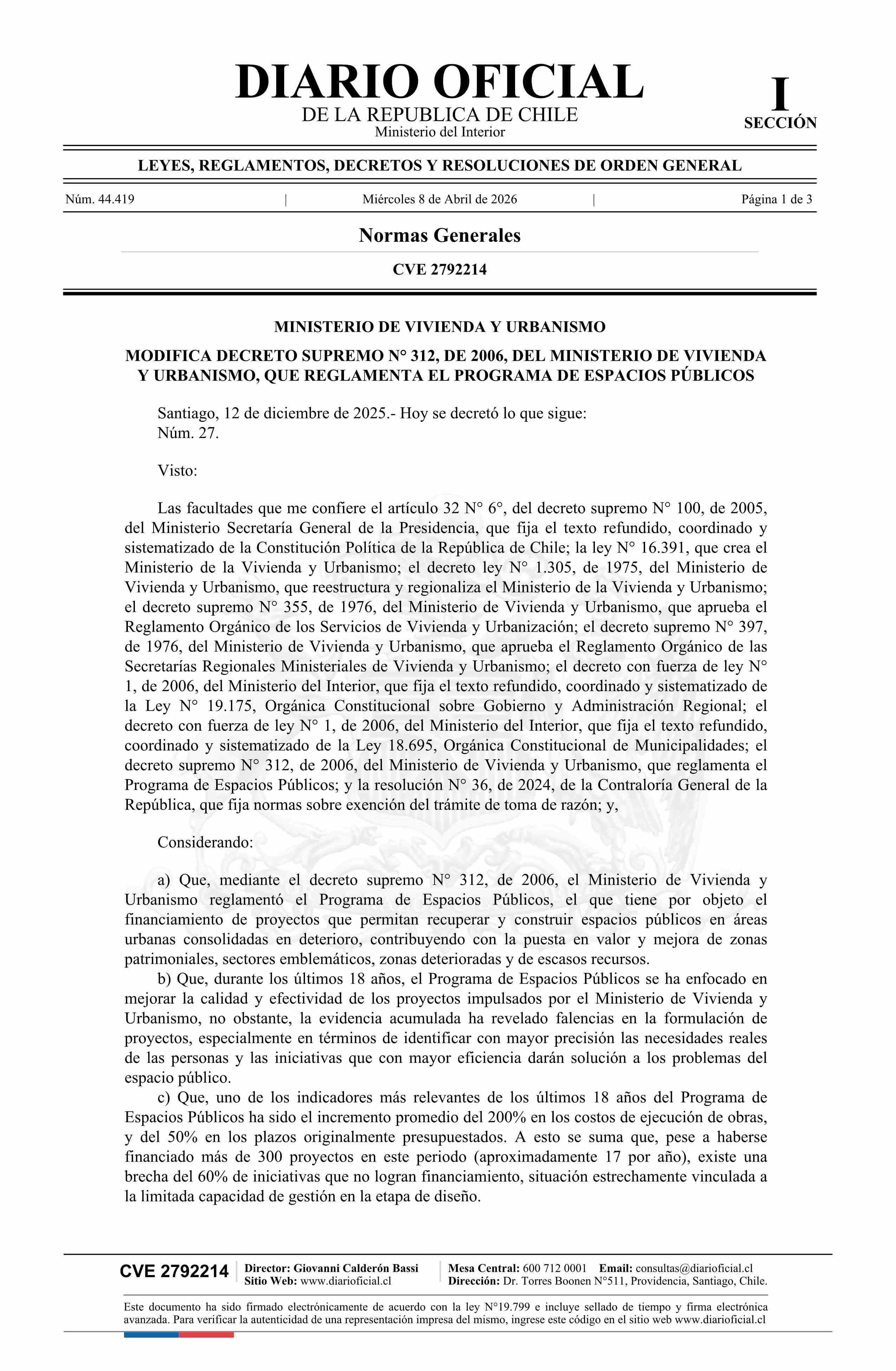 Título: Decreto número 27, de 2025.- Modifica decreto N° 312, de 2006, que reglamenta el Programa de Espacios Públicos