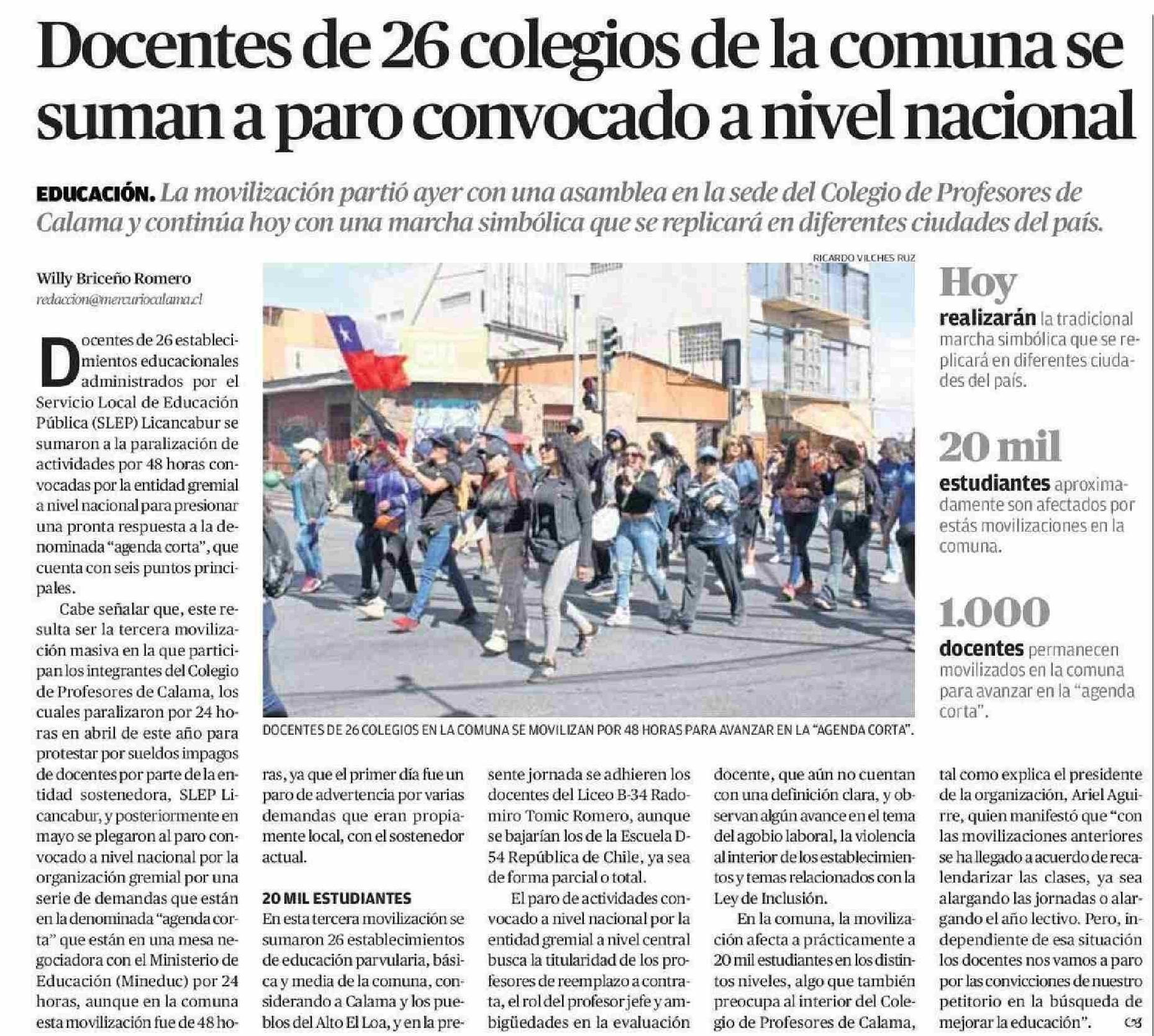 Docentes de 26 colegios de la comuna se suman a paro convocado a nivel nacional 05-06-2025 El Mercurio de Calama |