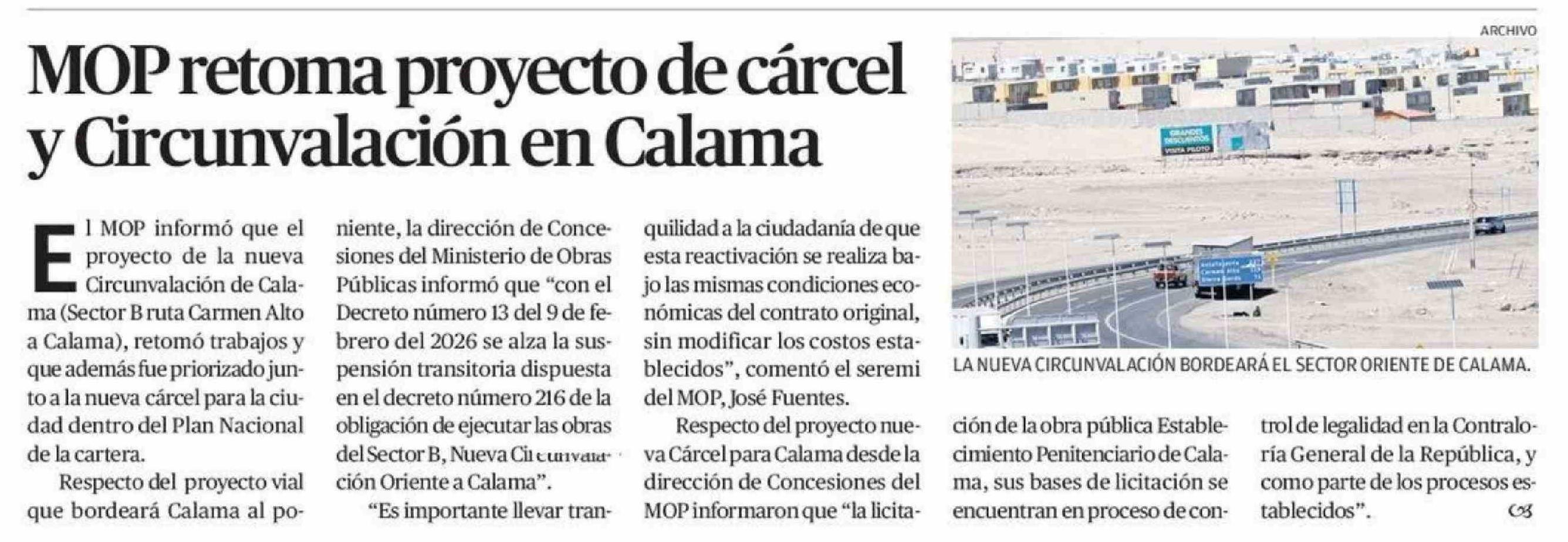 MOP retoma proyecto de cárcel y Circunvalación en Calama 26-04-2026 El Mercurio de Antofagasta |