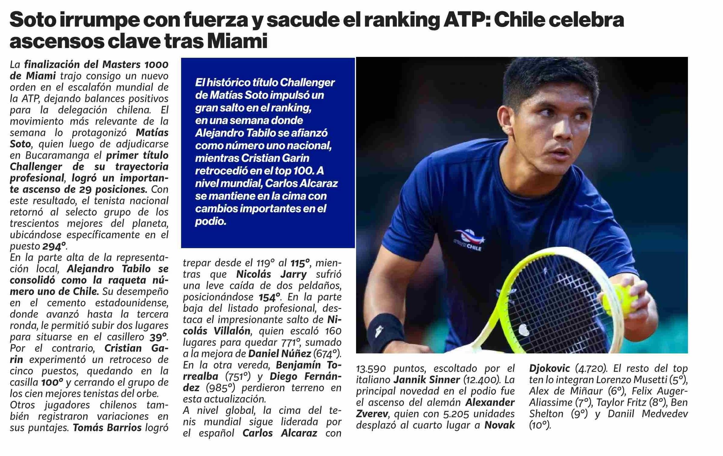 | Título: | Soto irrumpe con fuerza y sacude el ranking ATP: Chile celebra ascensos clave tras Miami |