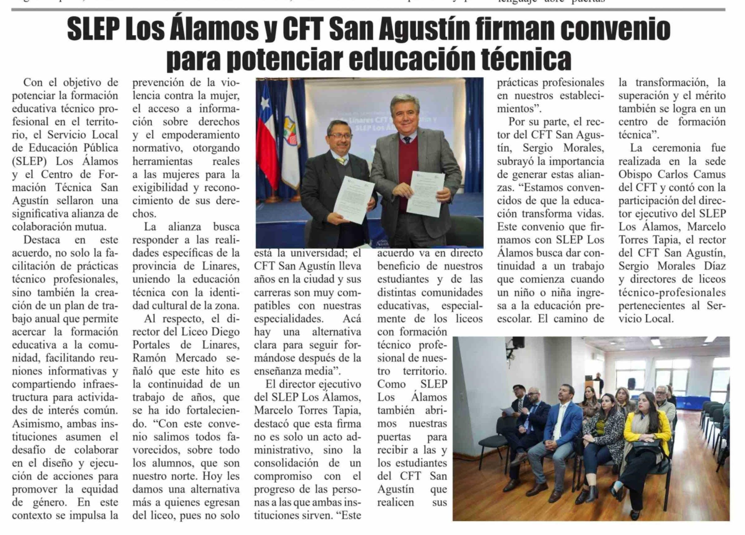Título: SLEP Los Alamos y CFT San Agustín firman convenio para potenciar educación técnica