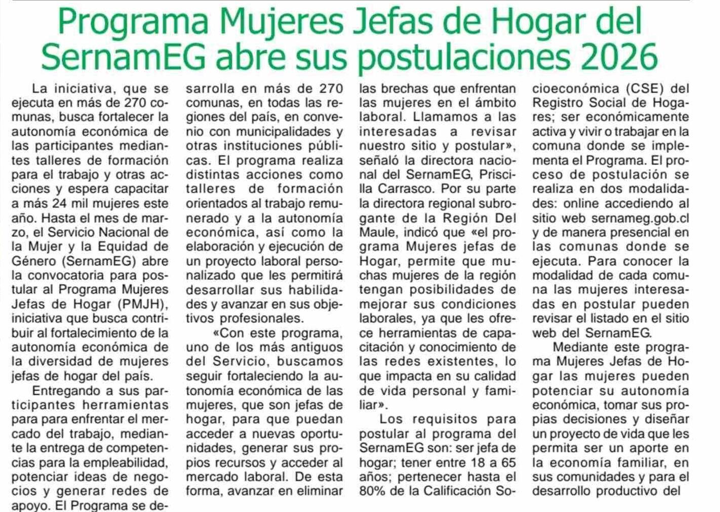 Título: Programa Mujeres Jefas de Hogar del SernamEG abre sus postulaciones 2026