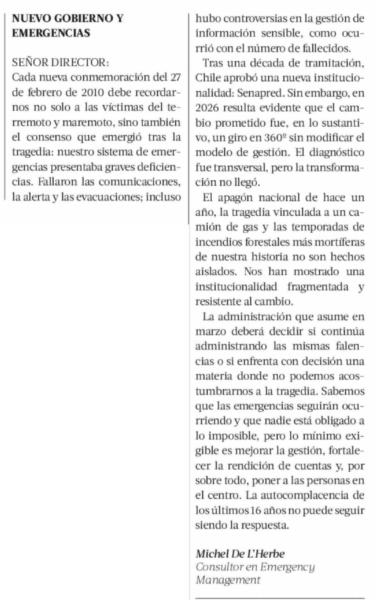 Cartas: NUEVO GOBIERNO Y EMERGENCIAS
