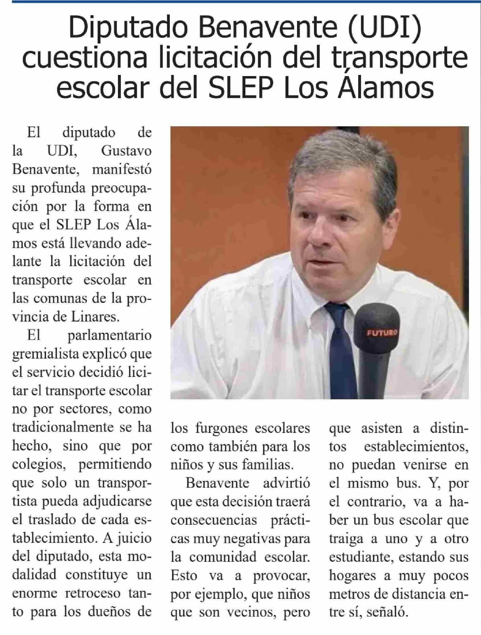 | Título: | Diputado Benavente (UDI) cuestiona licitación del transporte escolar del SLEP Los Alamos |