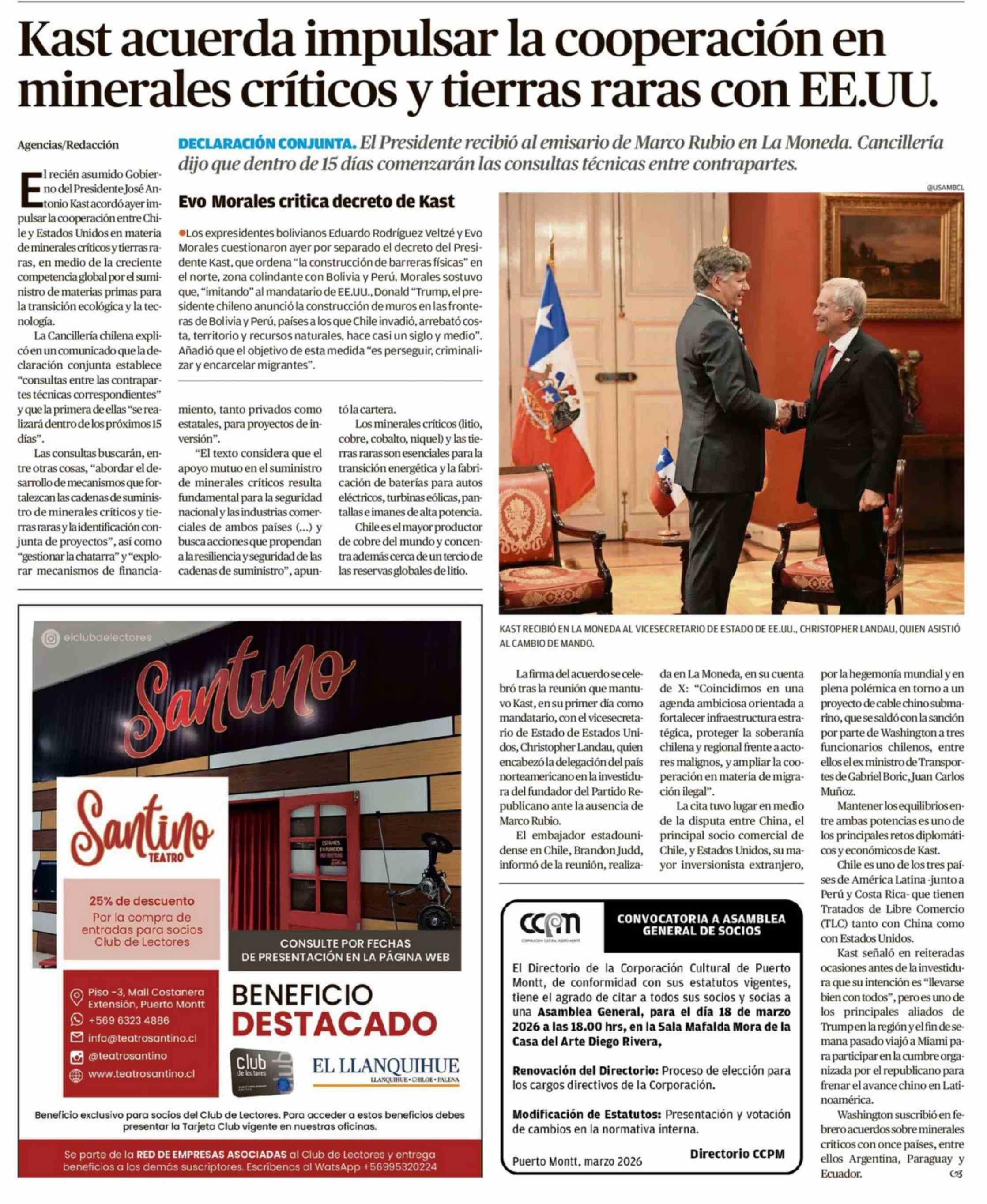 Título: Kast acuerda impulsar la cooperación en minerales críticos y tierras raras con EE.UU.