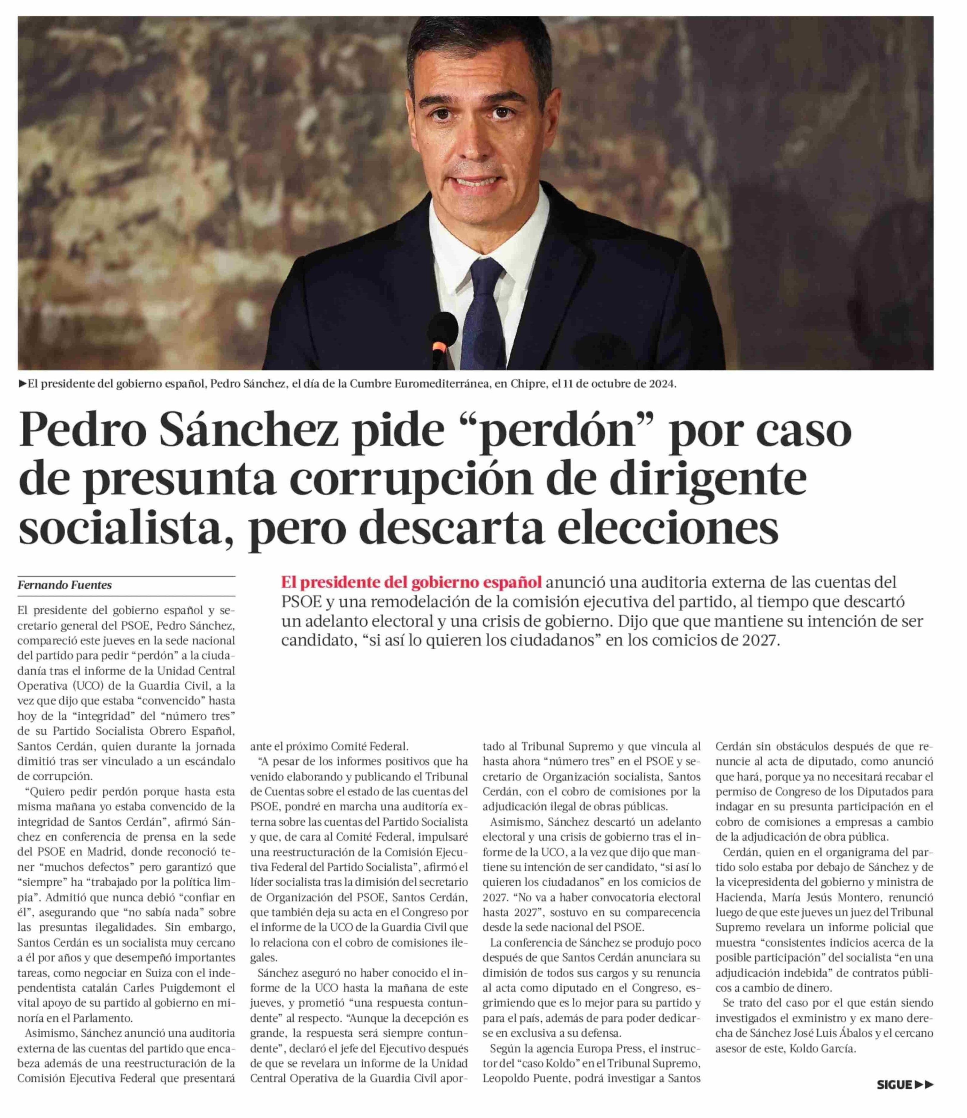 | Título: | Pedro Sánchez pide “perdón” por caso de presunta corrupción de dirigente socialista, pero descarta elecciones |