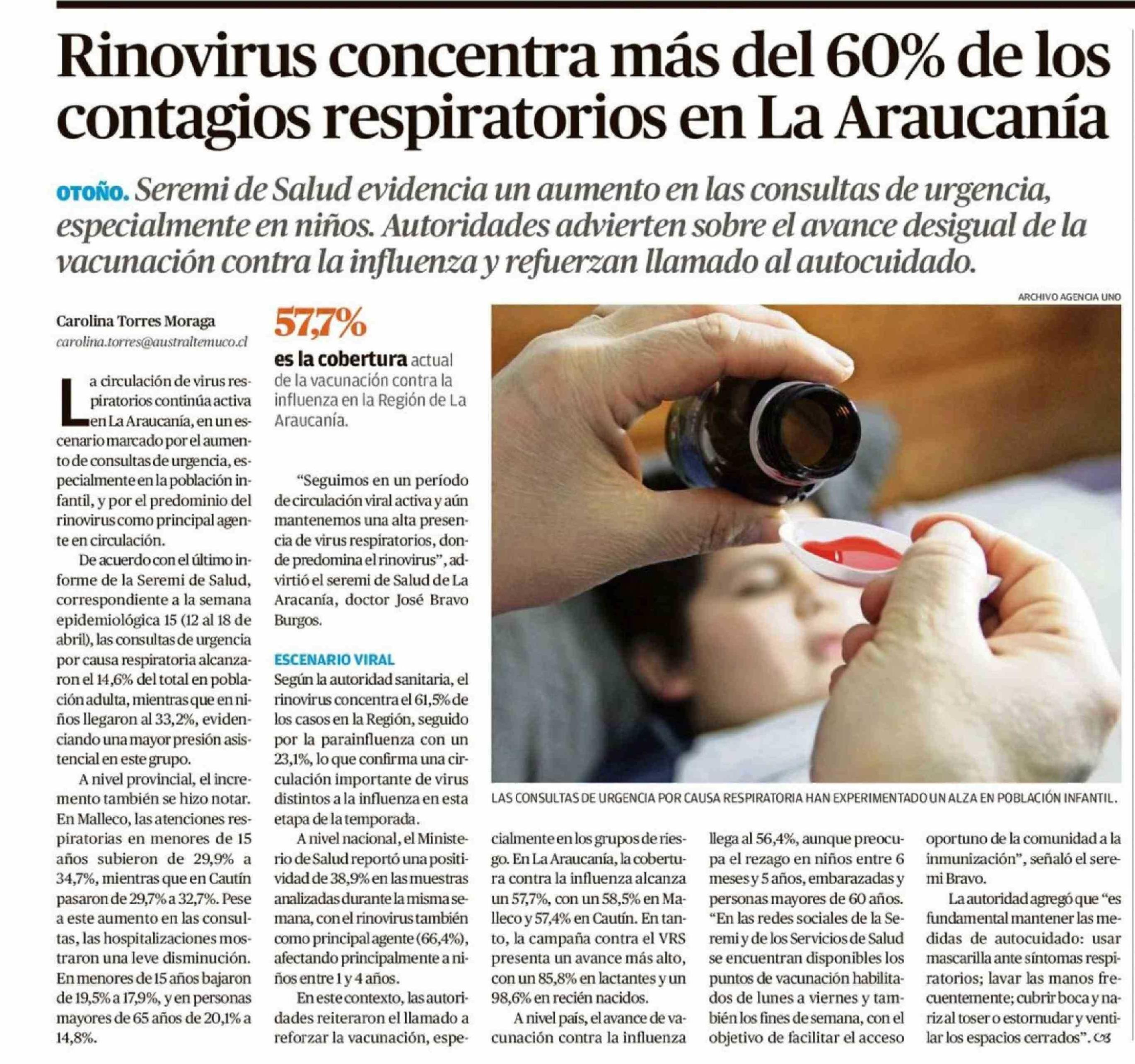 Rinovirus concentra más del 60% de los contagios respiratorios en La Araucanía 25-04-2026 El Austral de la Araucanía |