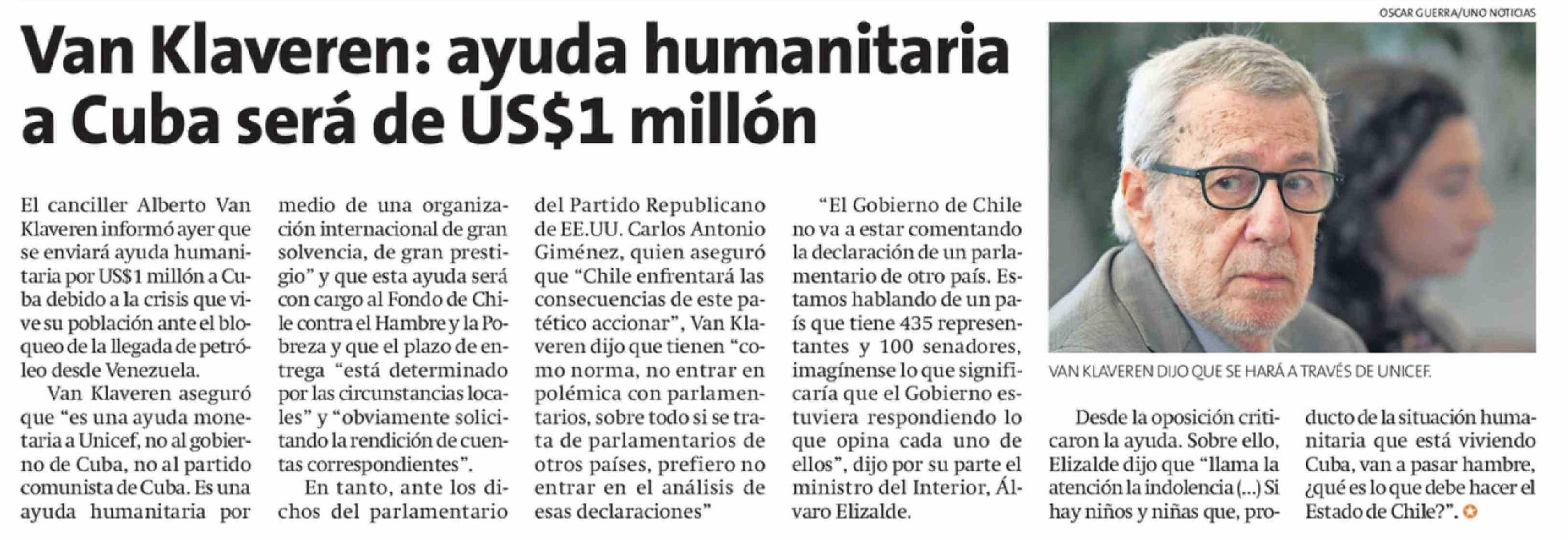 Título: Van Klaveren: ayuda humanitaria a Cuba será de US$1 millón