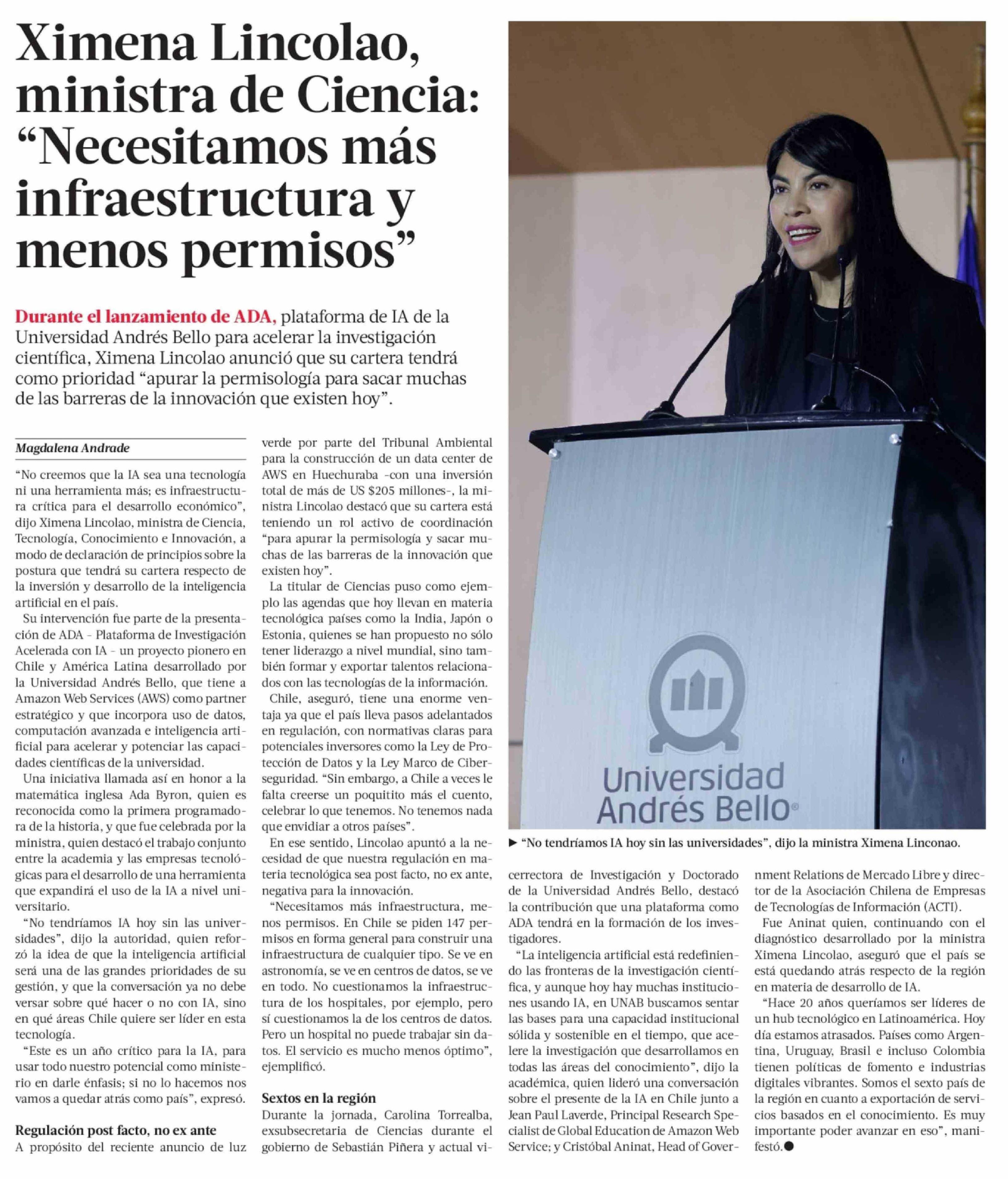 Título: Ximena Lincolao, ministra de Ciencia: "Necesitamos más infraestructura y menos permisos"