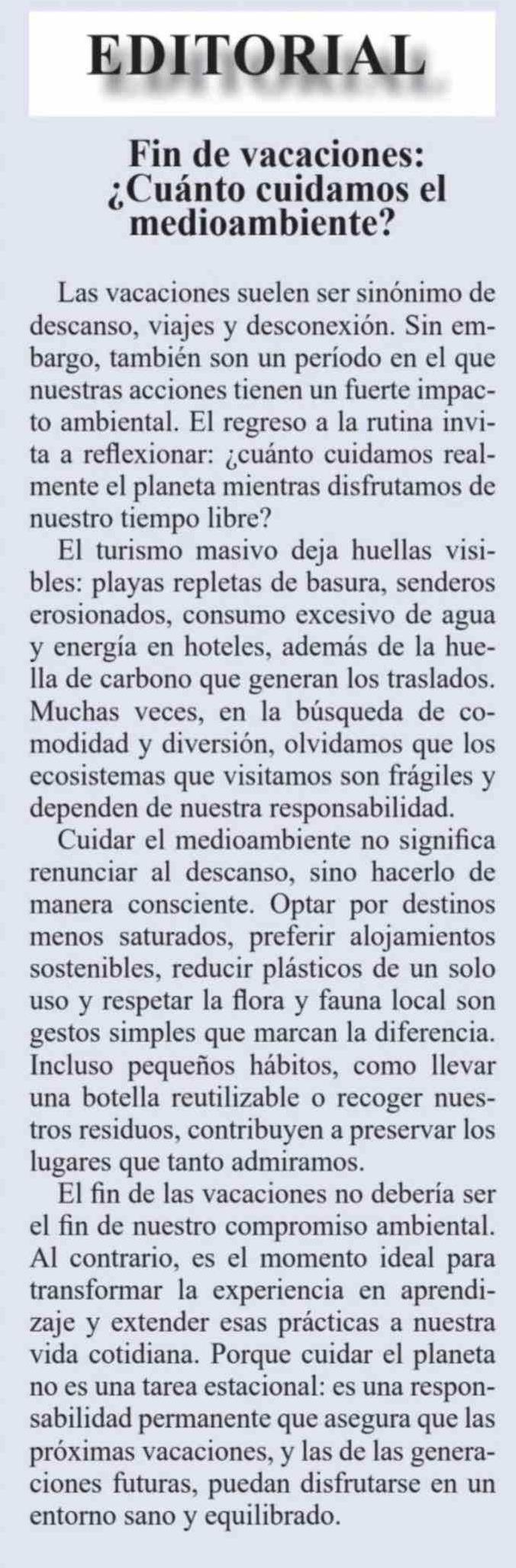 | Título: | Editorial: Fin de vacaciones: ¿Cuánto cuidamos el medioambiente? |