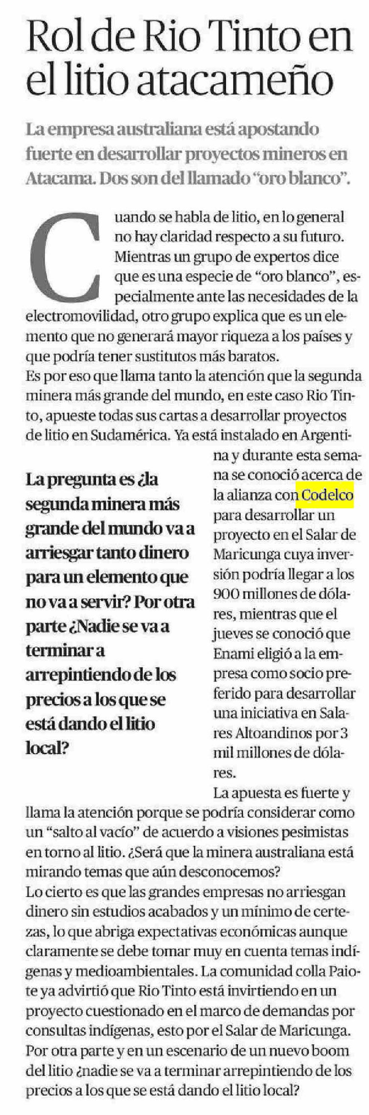 Rol de Rio Tinto en el litio atacameño 24-05-2025 El Diario de Atacama |