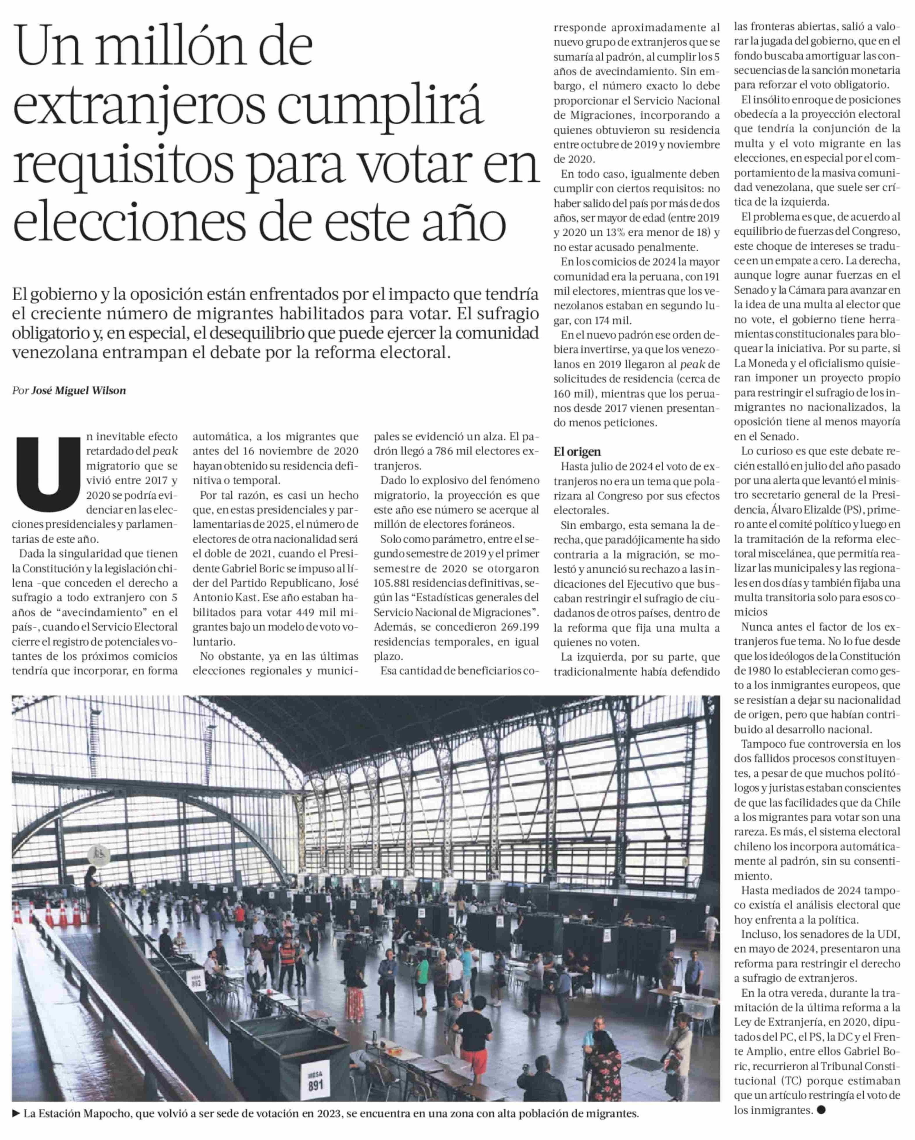 Un millón de extranjeros cumplirá requisitos para votar en elecciones de este año 08-02-2025 La Tercera |