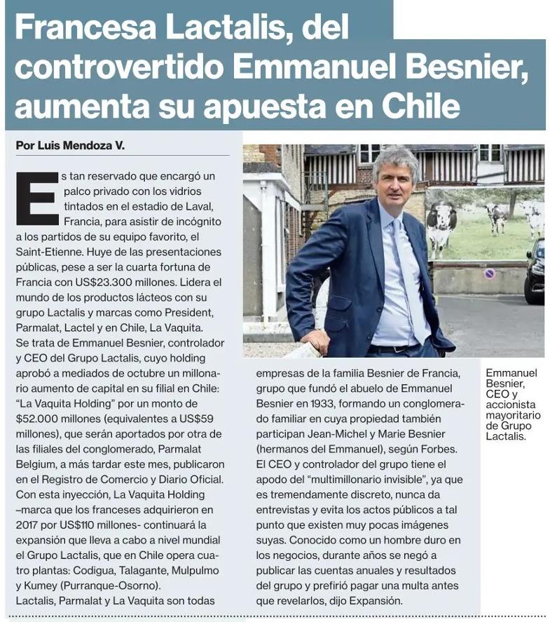 Francesa Lactalis, del controvertido Emmanuel Besnier, aumenta su apuesta en Chile 07-11-2023 La Segunda |