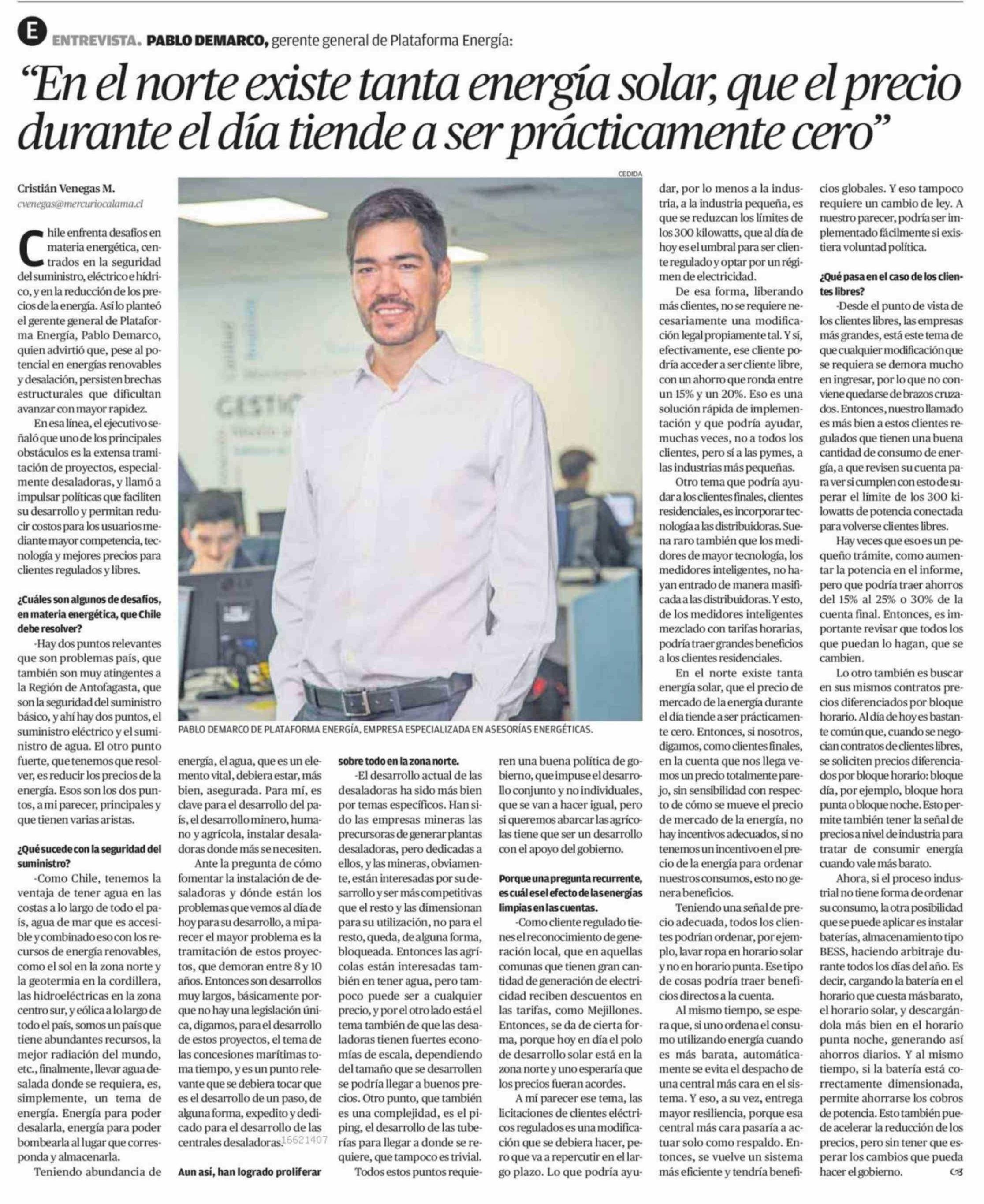 "En el norte existe tanta energía solar, que el precio durante el día tiende a ser prácticamente cero" 04-04-2026 El Mercurio de Calama |