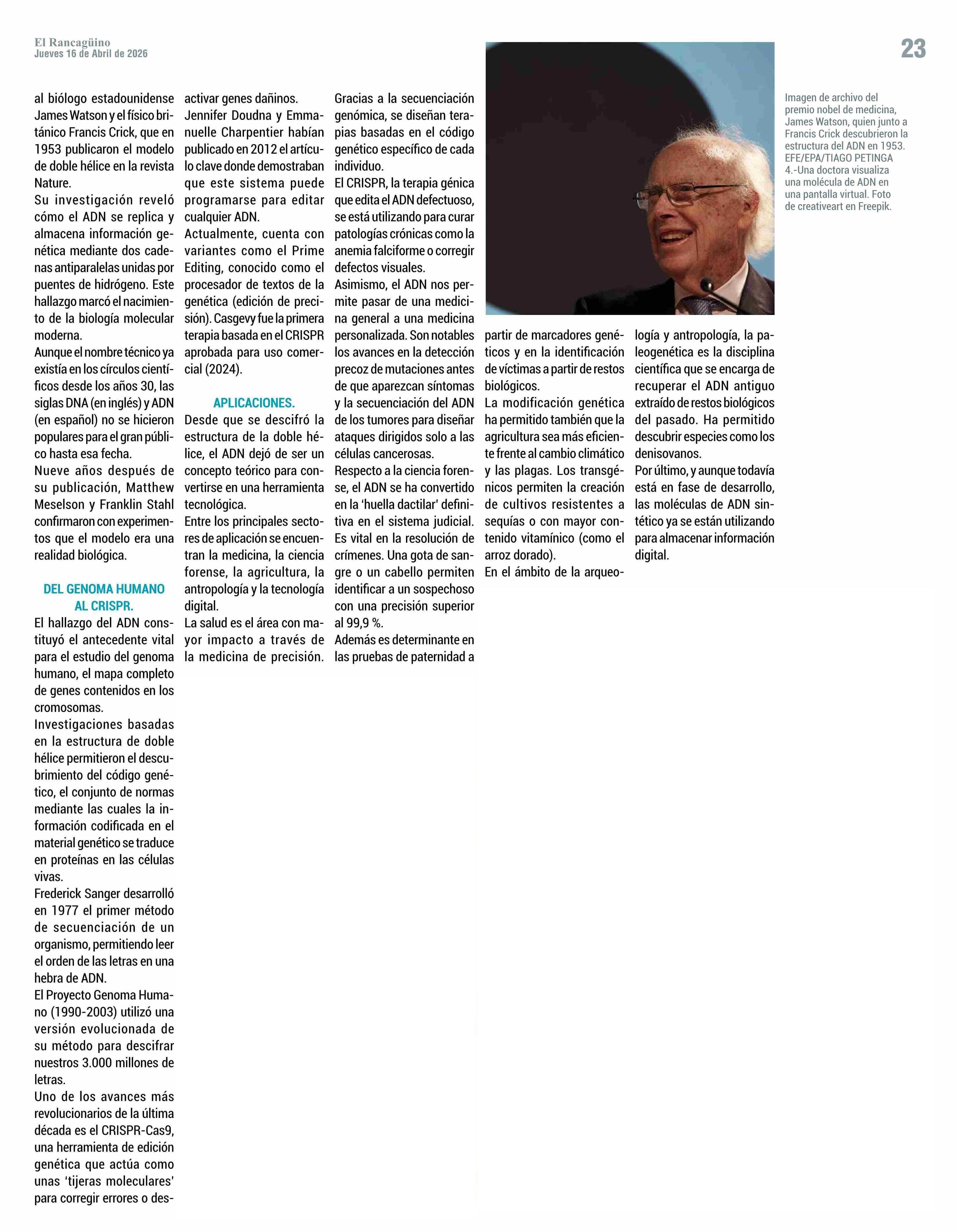 ADN: DE LA DOBLE HÉLICE A LA REVOLUCIÓN DEL CRISPR 16-04-2026 El Rancagüino |