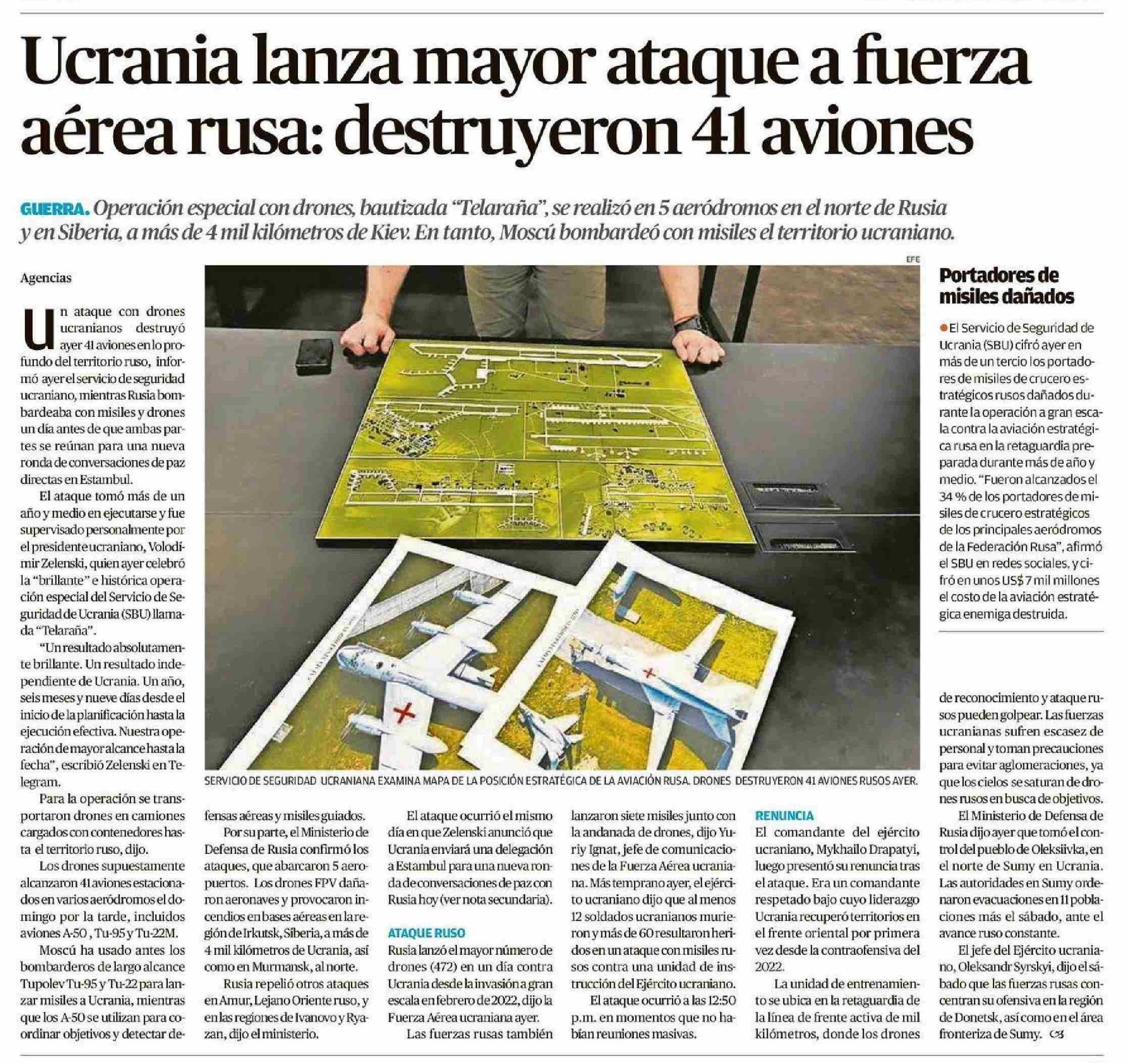 Ucrania lanza mayor ataque a fuerza aérea rusa: destruyeron 41 aviones 02-06-2025 El Llanquihue |