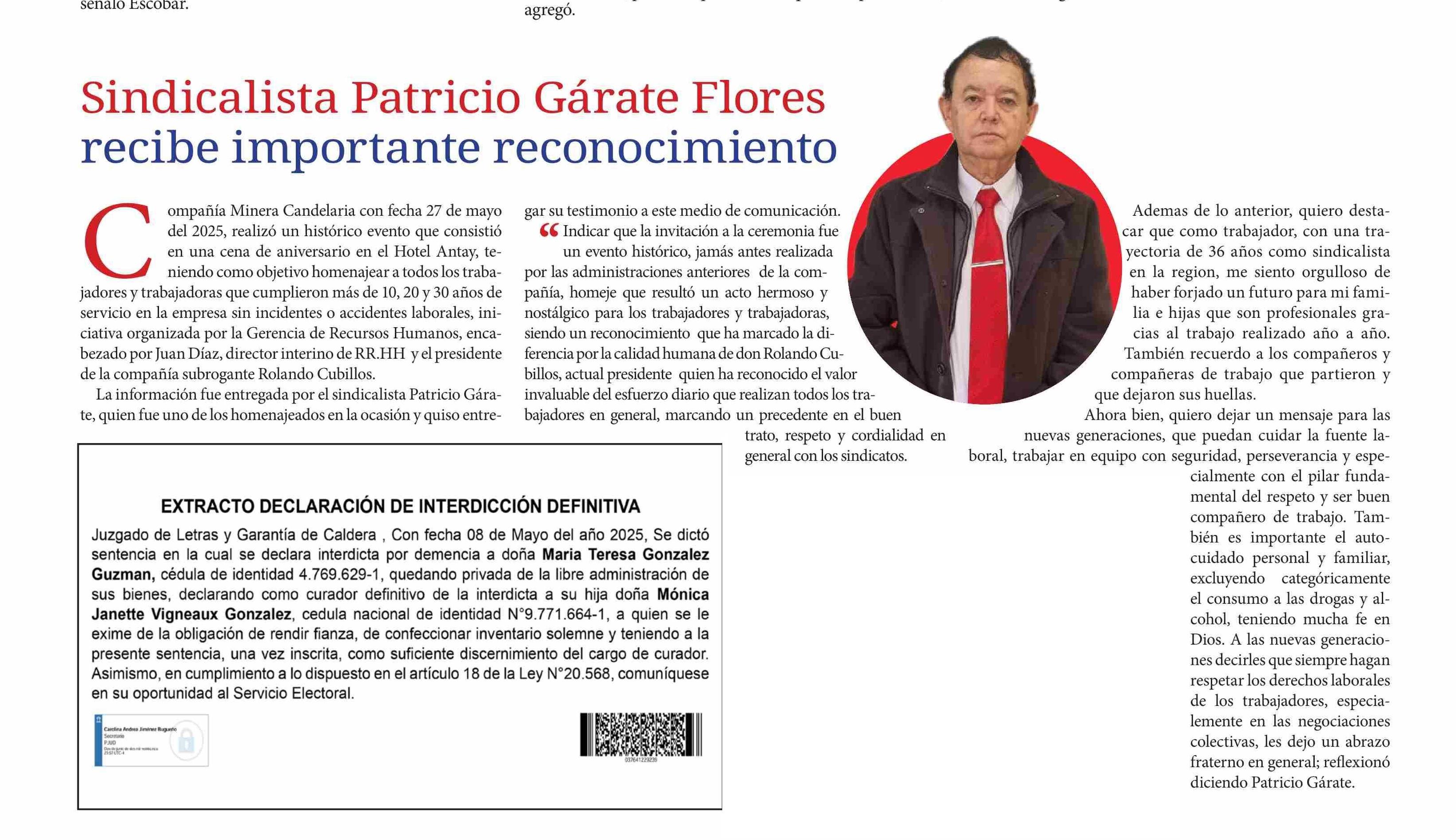 Sindicalista Patricio Gárate Flores recibe importante reconocimiento 04-06-2025 Diario Chañarcillo |
