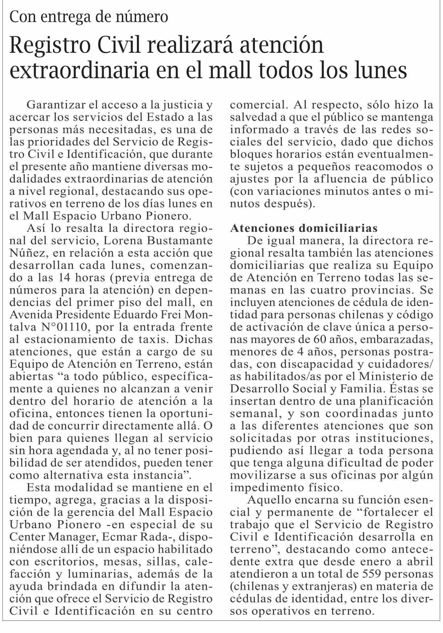 Registro Civil realizará atención extraordinaria en el mall todos los lunes 29-05-2025 El Pingüino |