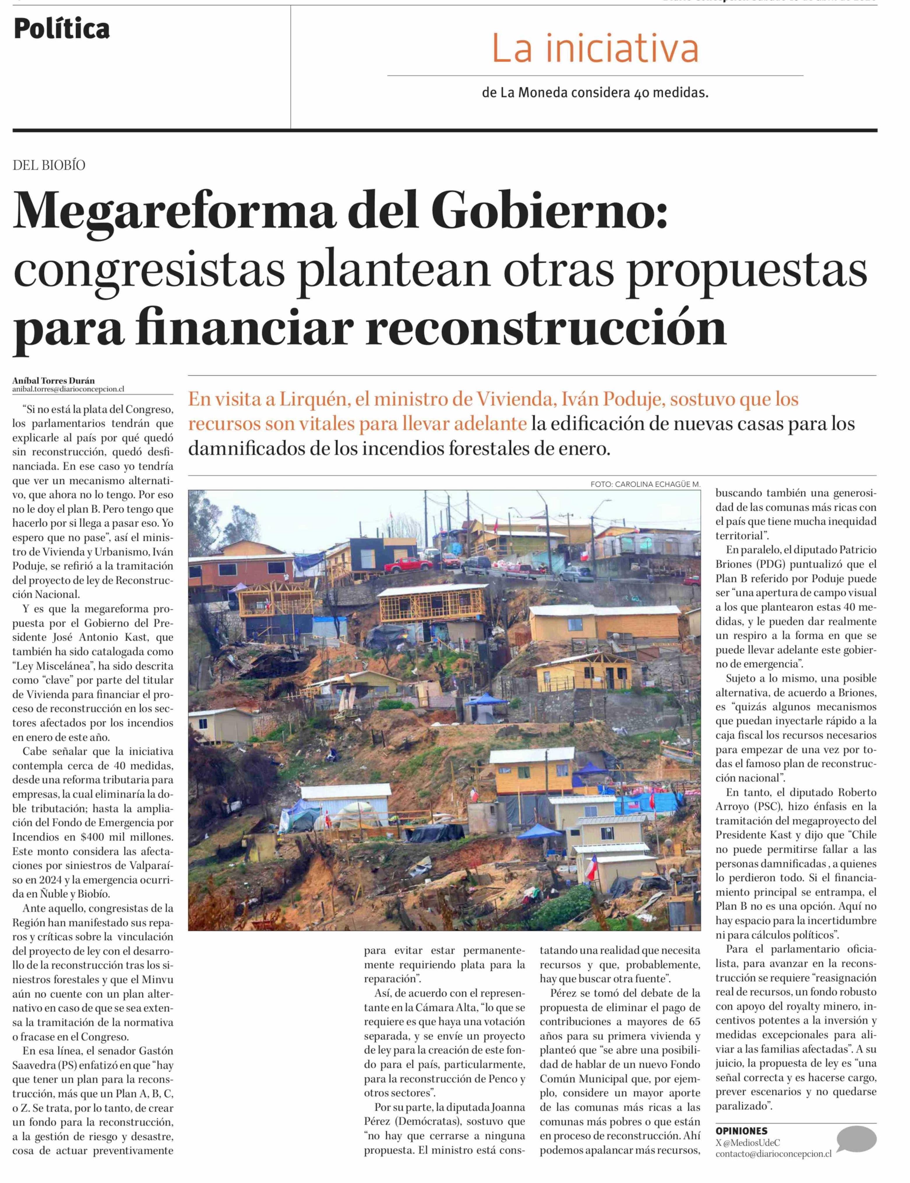 Megareforma del Gobierno: congresistas plantean otras propuestas para financiar reconstrucción 18-04-2026 Diario Concepción |