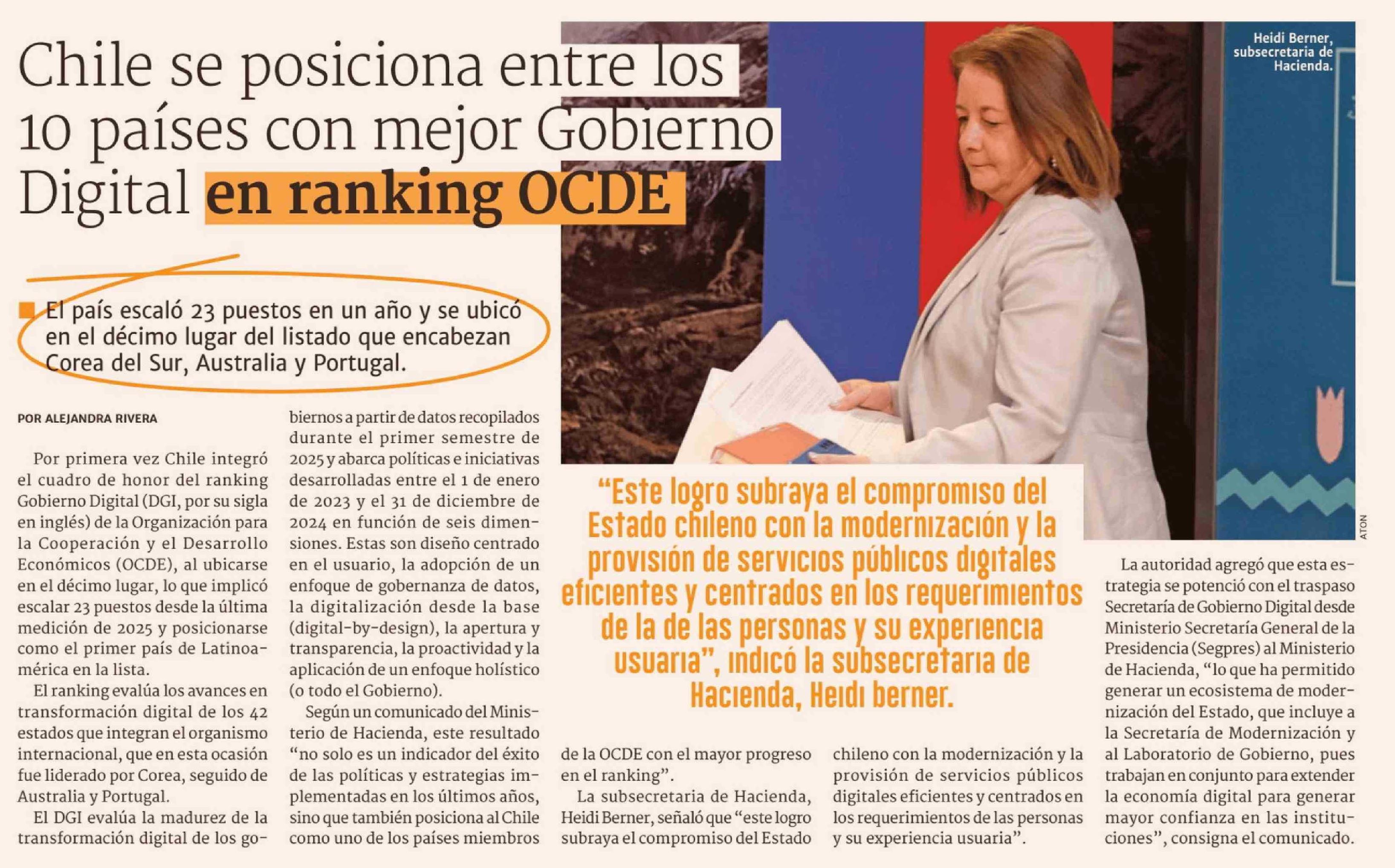 Chile se posiciona entre los 10 países con mejor Gobierno Digital en ranking OCDE 17-02-2026 Diario Financiero |