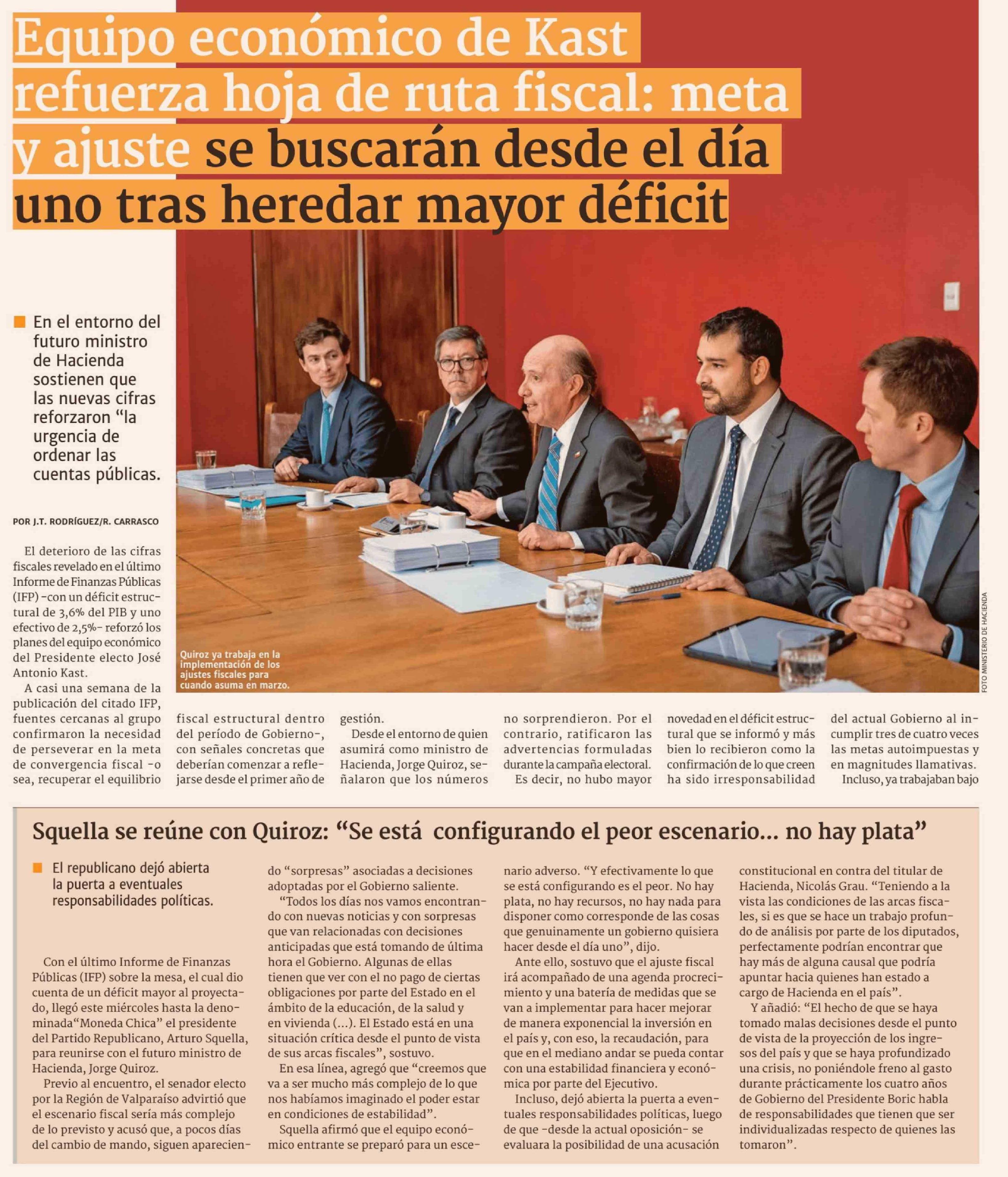 Título: Equipo económico de Kast refuerza hoja de ruta fiscal: meta y ajuste se buscarán desde el día uno tras heredar mayor déficit