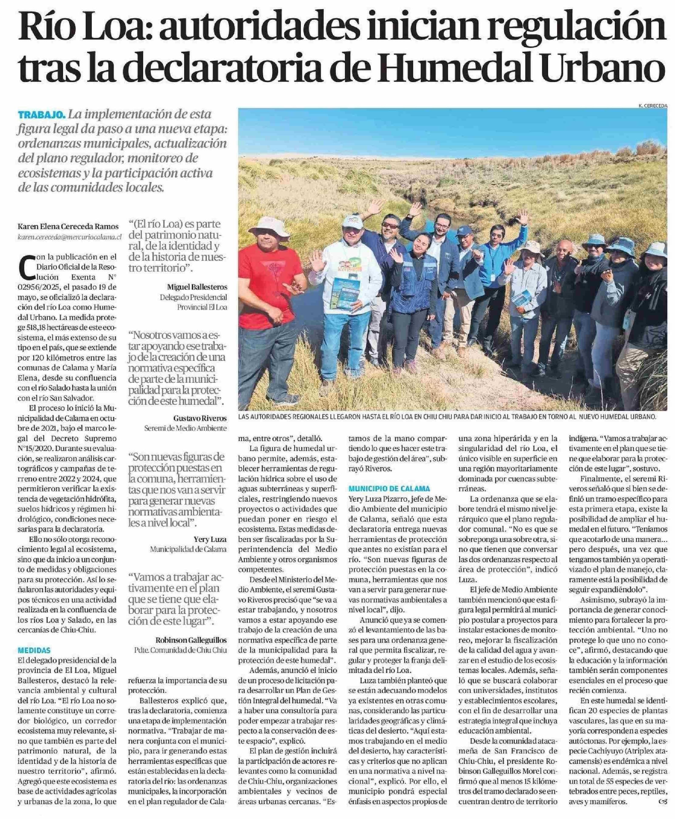 Río Loa: autoridades inician regulación tras la declaratoria de Humedal Urbano 28-05-2025 El Mercurio de Antofagasta |
