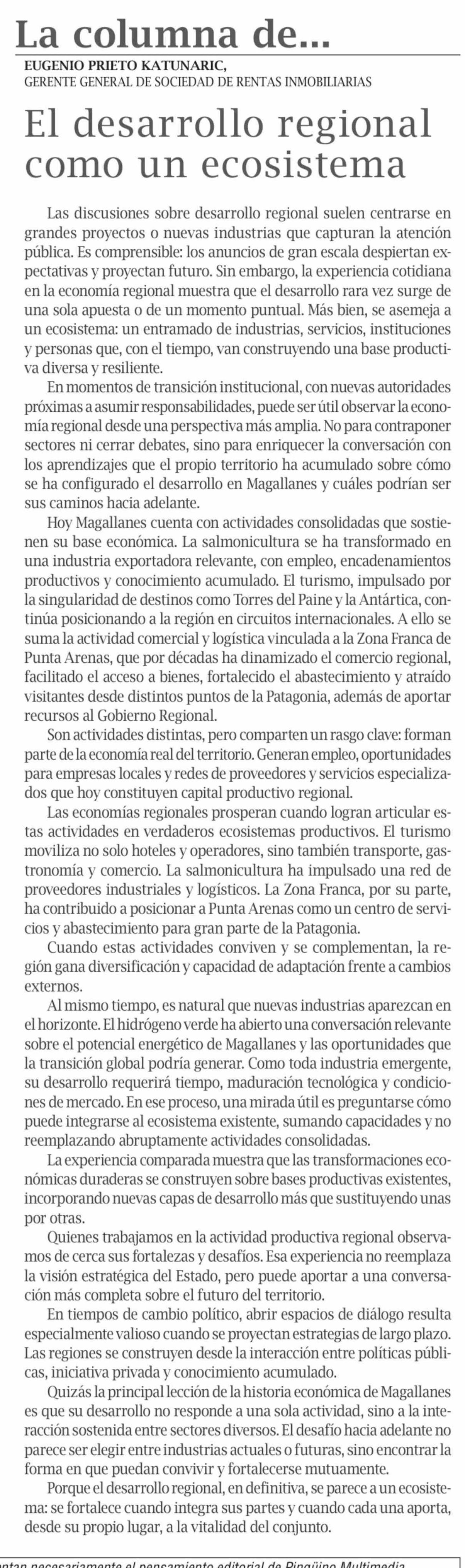 Columnas de Opinión: El desarrollo regional como un ecosistema 10-03-2026 El Pingüino |