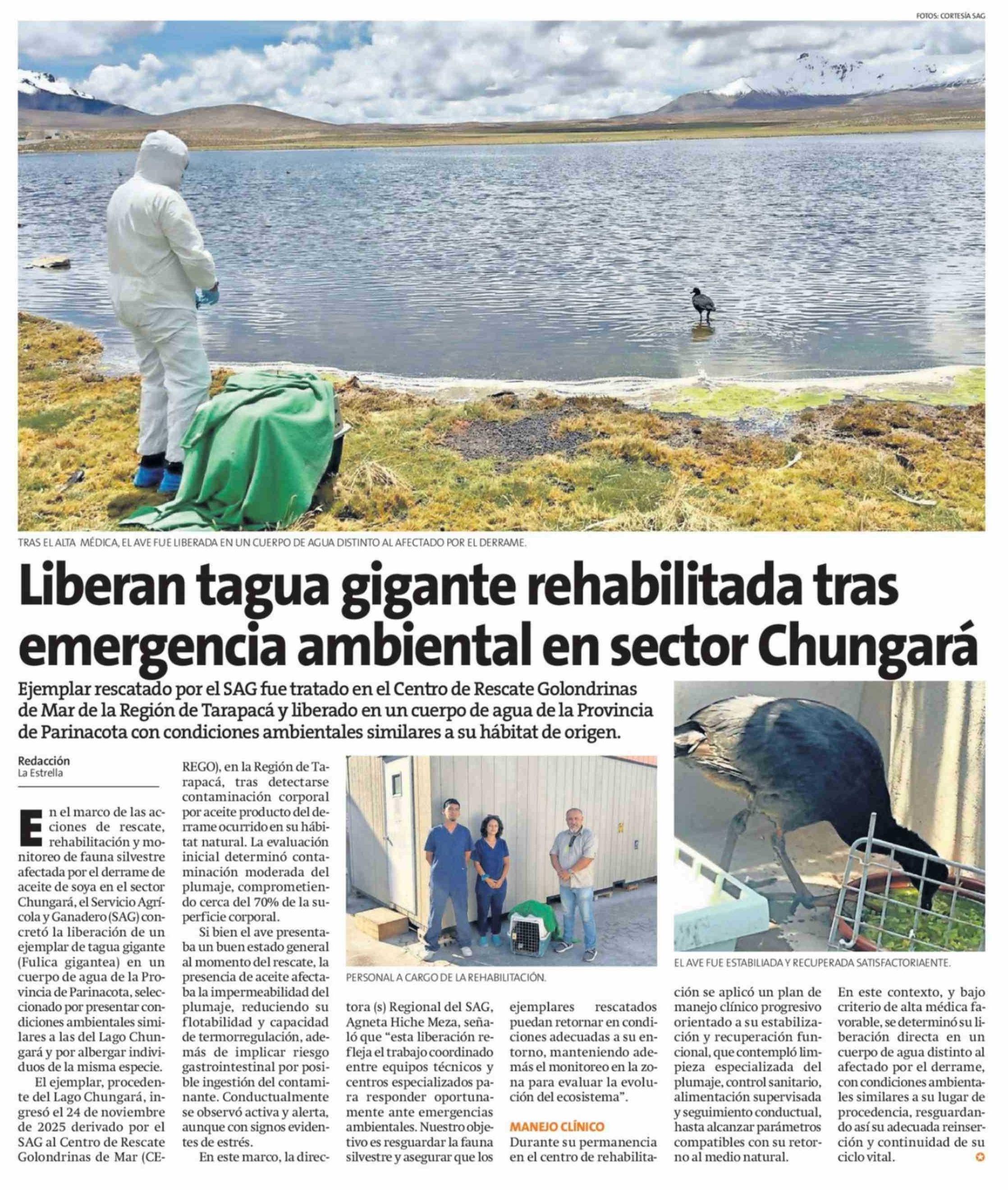 Liberan tagua gigante rehabilitada tras emergencia ambiental en sector Chungará 12-02-2026 La Estrella de Arica |