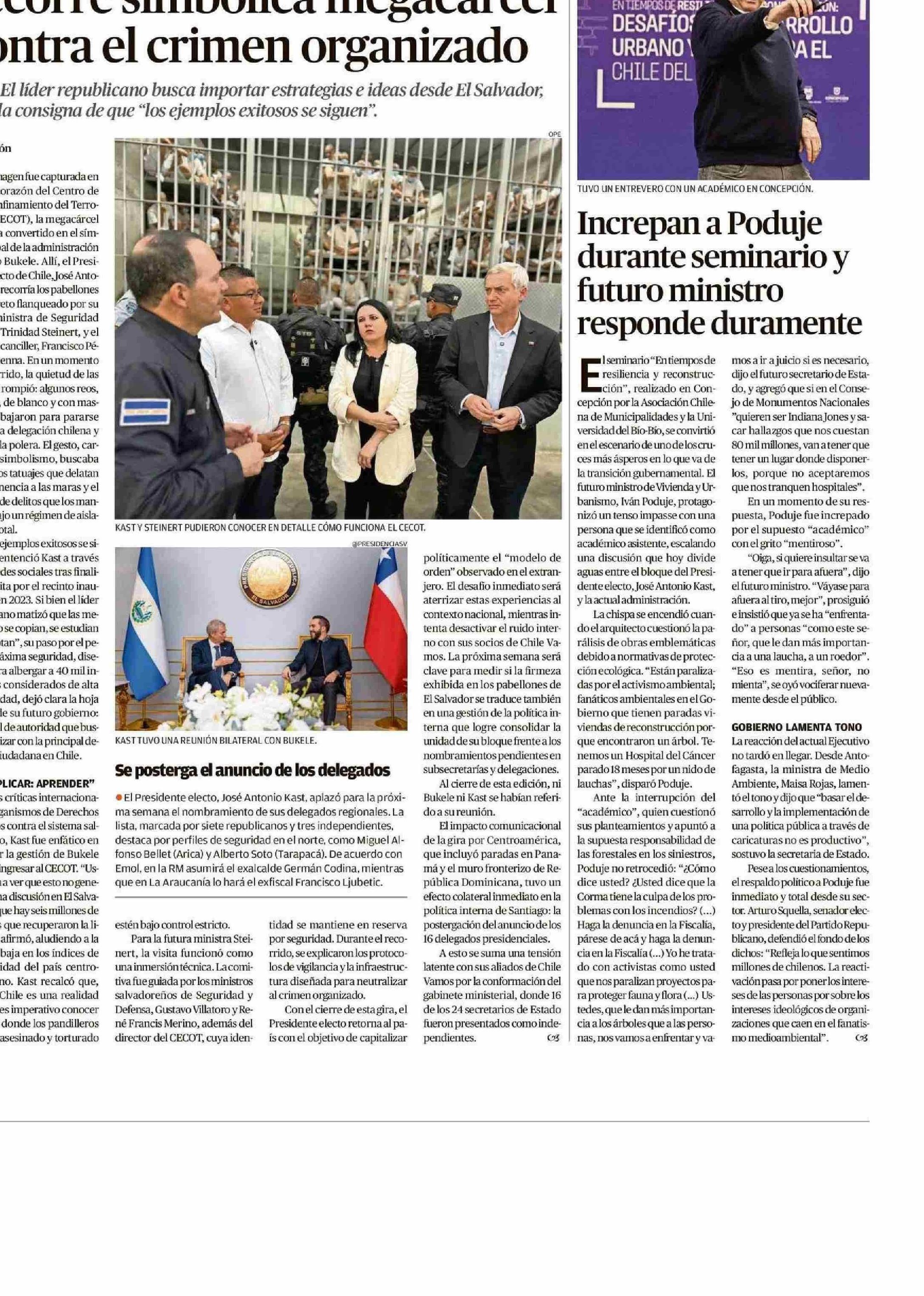 Título: Kast se reúne con Bukele y recorre simbólica megacárcel contra el crimen organizado